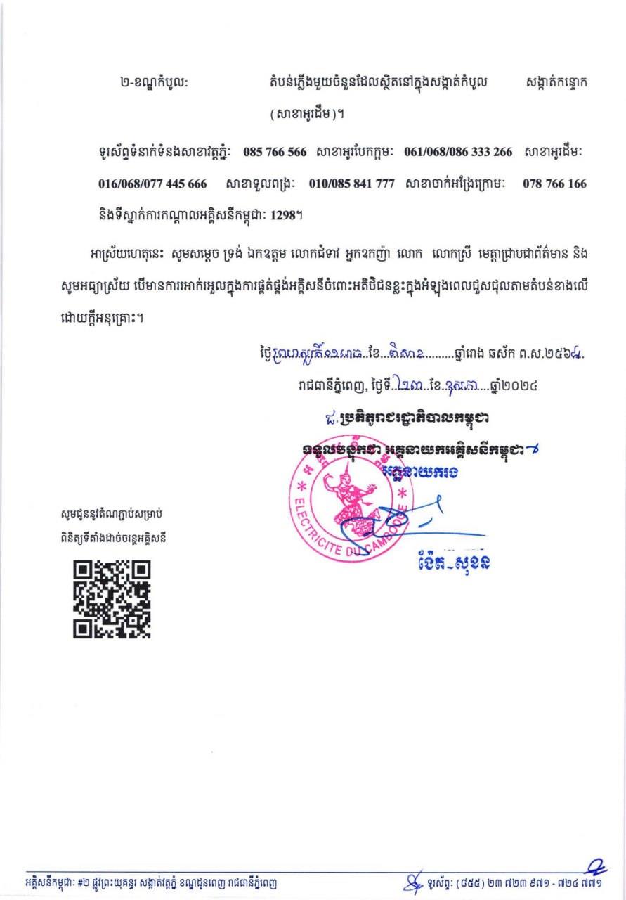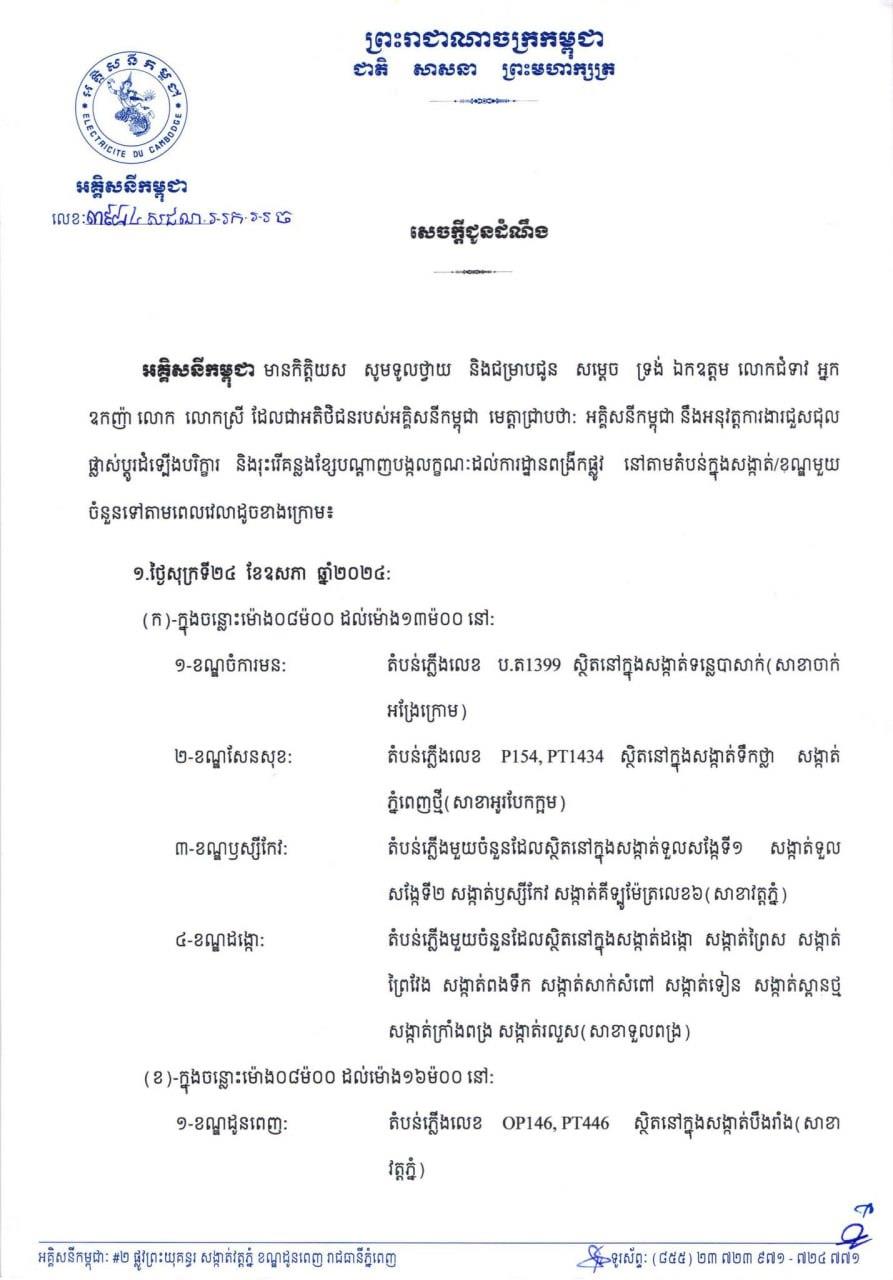 សូមអានសេចក្តីជូនដំណឹង របស់អគ្គិសនីកម្ពុជា ដូចខាងក្រោម ៖