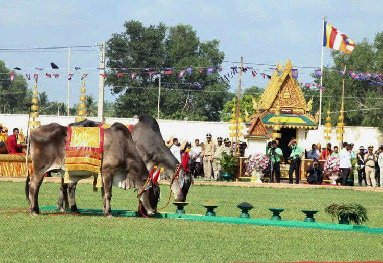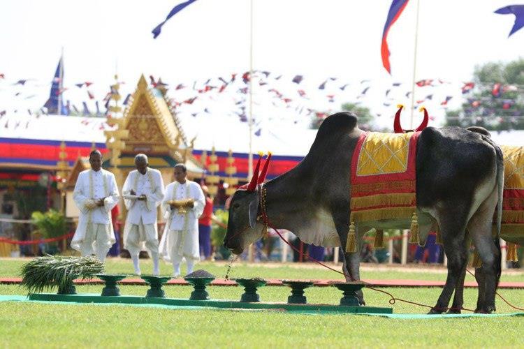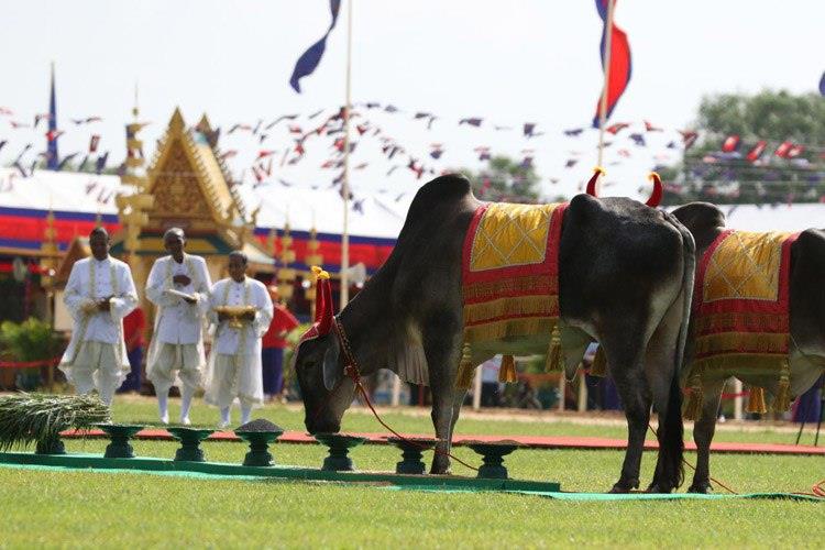 ទាក់ទិននឹងការផ្សងគោឧសភរាជគឺ ព្រាហ្មណ៍ព្រះរាជគ្រូ សូត្រពាក្យអធិដ្ឋានផ្សងគោឧសភរាជ ដែលទឹមច្រត់ព្រះនង្គ័លនោះ ឱ្យស៊ីផឹកអាហារ៧យ៉ាង ដែលភ្នាក់ងាររៀបដាក់តុប្រាក់ធំៗ តាំងទុកនៅទីមុខព្រះពន្លា គឺគ្រាប់ស្រូវ១តុ គ្រាប់សណ្ដែក១តុ គ្រាប់ពោត១តុ គ្រាប់ល្ង១តុ ស្មៅស្រស់១តុ ទឹក១តុ ស្រា១តុ ។ សូត្រចប់ព្រាហ្មណ៍ព្រះរាជគ្រូ យកទឹក មន្ដប្រោះក្បាលព្រះគោទាំងពីរ ហើយមន្ដ្រីម្នាក់ដែលកាន់នង្គ័លស្ដេចមាឃ ដឹកគោឧសភរាជទាំងពីរទៅឱ្យស៊ីផឹក របស់ទាំង៧យ៉ាង គឺដឹកទៅជិតរបស់៧យ៉ាងស្រេចហើយ តែគោឧសភរាជចូលចិត្ដស៊ីផឹកអ្វី ក៏ស៊ីផឹកទៅគេមិនបង្ខំឱ្យស៊ីផឹក ចំពោះអាហារណានីមួយៗទេ កាលព្រះគោស៊ីផឹកអ្វីមួយយ៉ាង ឬពីរយ៉ាងព្រាហ្មណ៍ក៏ទាយផលប្រផ្នូលទៅខាងមុខតាមនោះប្រកាសផ្សាយ៕ ផ្ដល់សិទ្ធិដោយ៖ Freshnews