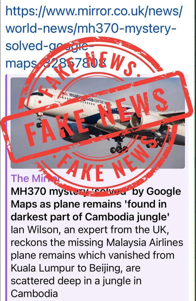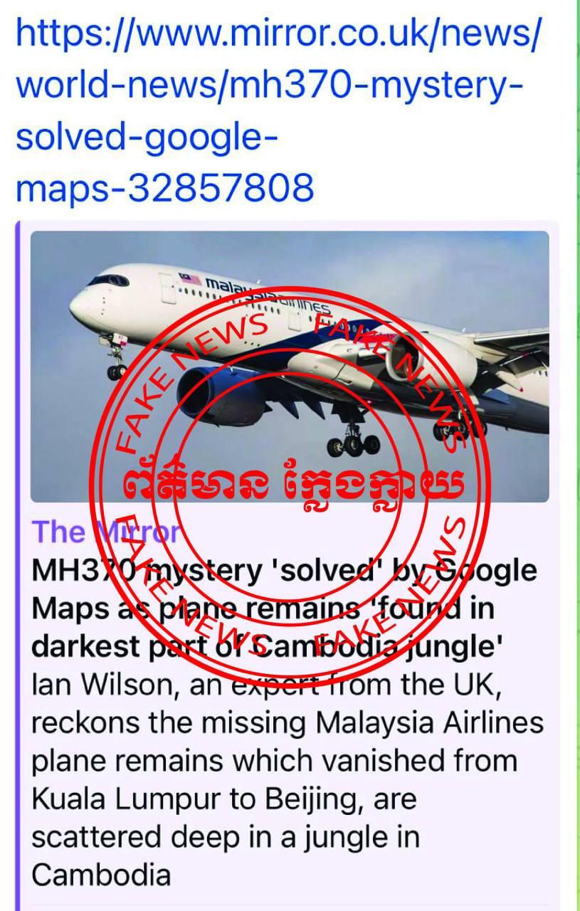 អ្នកនាំពាក្យរូបនេះបញ្ជាក់ថា ការចុះផ្សាយរបស់ព័ត៌មាន The Mirror អំពីយន្តហោះ MH370 នៅកម្ពុជា គឺជាព័ត៌មានក្លែងក្លាយ។