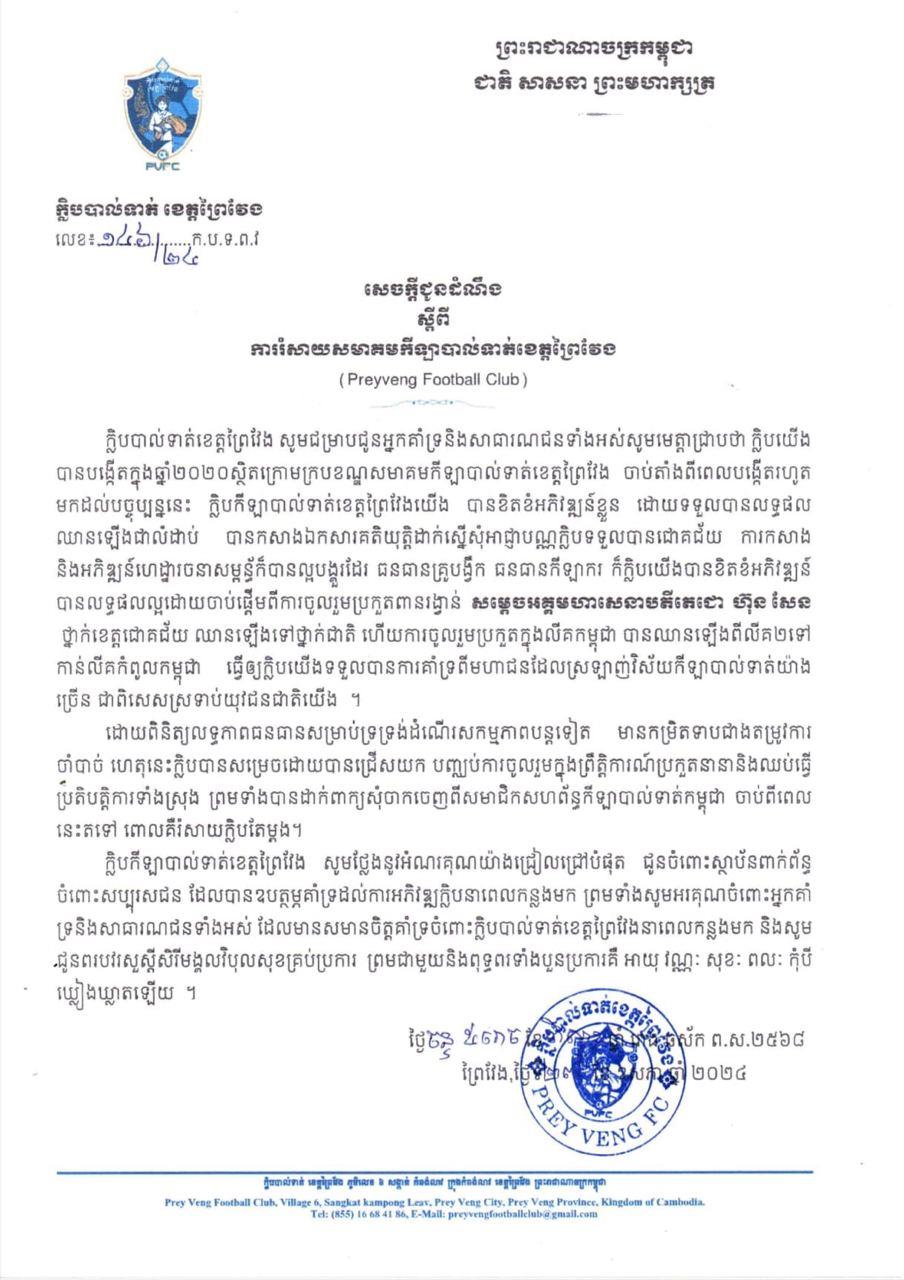 (ភ្នំពេញ)៖ ទីបំផុតក្លិបបាល់ទាត់ខេត្តព្រៃវែង បានប្រកាសរំសាយក្លិបជាផ្លូវការហើយ ក្រោយបញ្ចប់ការប្រកួតលីគកំពូលកម្ពុជា (CPL) និងពានរង្វាន់សម្ដេចតេជោ ហ៊ុន សែន ឆ្នាំ២០២៣/២២៤ ។ យោងតាមកសេចក្ដីជូនដំណឹងរបស់ក្លិប នៅថ្ងៃទី២៧ ខែឧសភា ឆ្នាំ២០២៤ ម្សិលមិញ បញ្ហាហិរញ្ញវត្ថុ គឺជាមូលហេតុច្បង ដែលនាំឲ្យក្លិបមានមូលដ្ឋាននៅខេត្តព្រៃវែងមួយនេះ ត្រូវរំសាយ ។