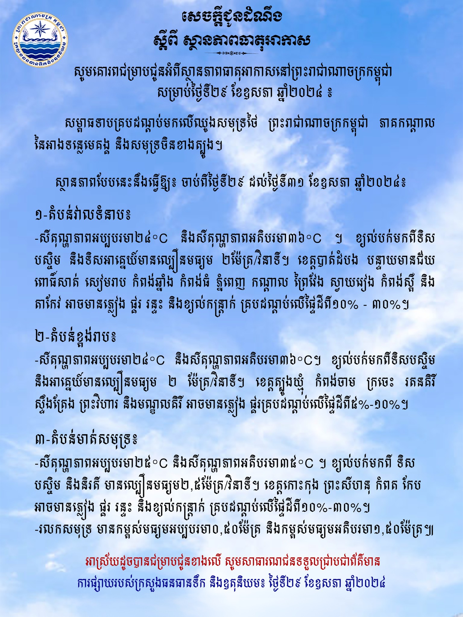 ក្រសួងធនធានទឹក ជូនដំណឹងអំពីស្ថានភាពធាតុអាកាសនៅកម្ពុជា សម្រាប់ថ្ងៃទី២៩ ខែឧសភា ឆ្នាំ២០២៤