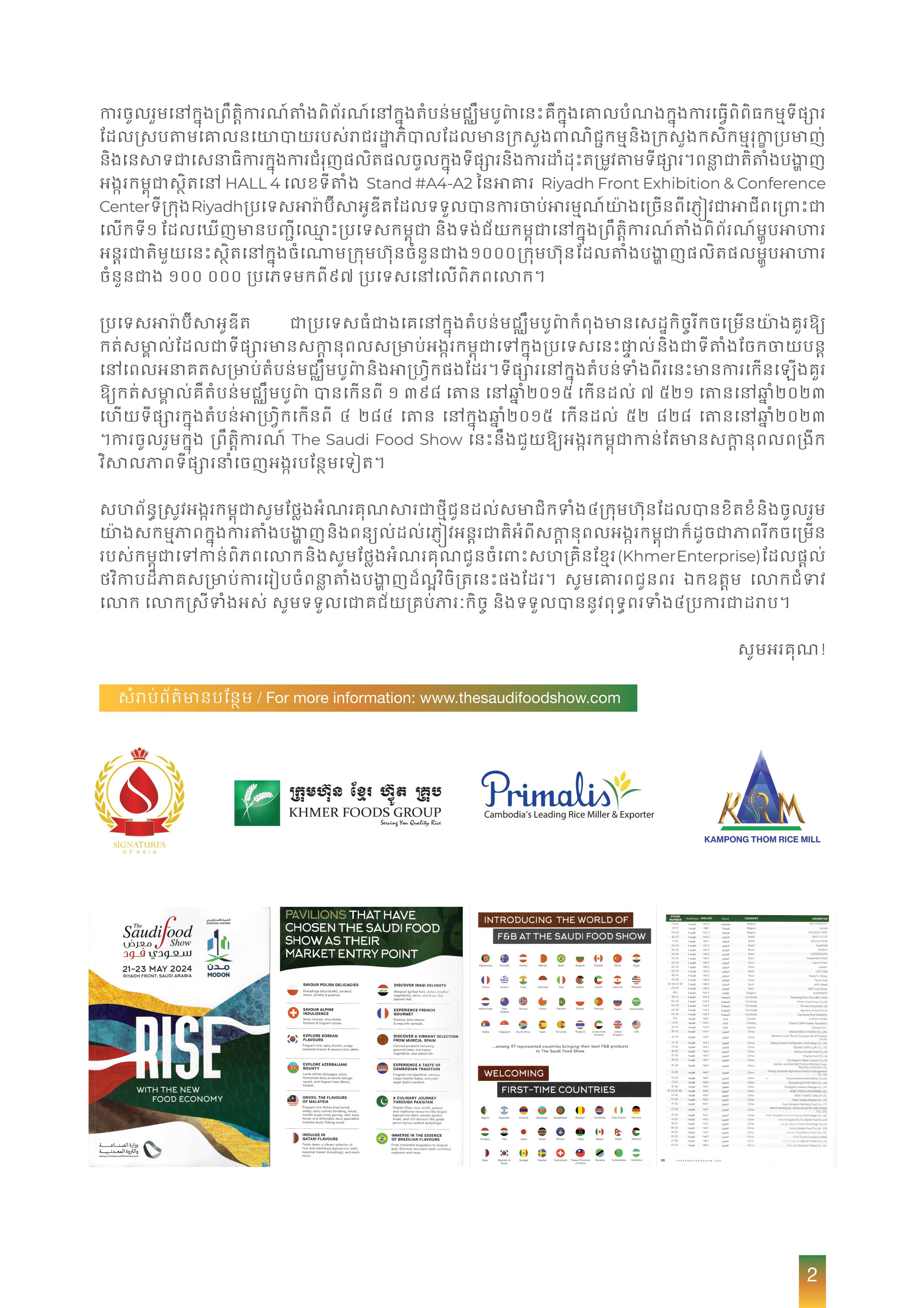 ការចូលរួមព្រឹត្តិការណ៍ The Saudi Food Show នេះ គឺជាការចូលរួមលើកដំបូងរបស់ប្រទេសកម្ពុជា ដែលសហព័ន្ធស្រូវអង្ករកម្ពុជាបានរៀបចំនូវពន្លាជាតិមួយយ៉ាងស្រស់ស្អាតទំហំ ៦០ម៉ែត្រការ៉េ ។