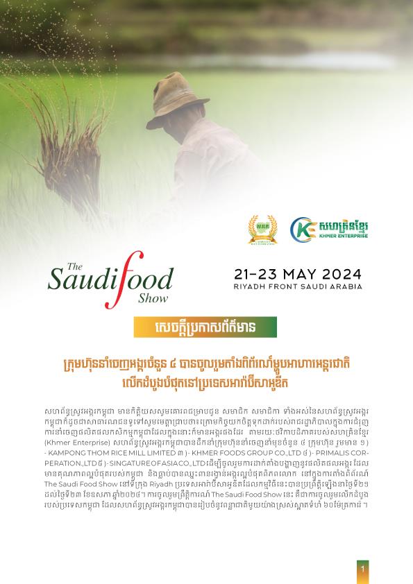 (ភ្នំពេញ)៖ ក្រោមកិច្ចយកចិត្តទុកដាក់របស់រាជរដ្ឋាភិបាល ក្នុងការជំរុញការនាំចេញផលិតផលកសិកម្មកម្ពុជា ដែលក្នុងនោះក៏មានអង្ករផងដែរ តាមរយៈថវិកាបដិភាគរបស់សហគ្រិនខ្មែរ (Khmer Enterprise) សហព័ន្ធស្រូវអង្ករកម្ពុជា បានដឹកនាំក្រុមហ៊ុននាំចេញនាំមុខចំនួន ៤ ក្រុមហ៊ុន ដើម្បីចូលរួមការដាក់តាំងបង្ហាញនូវផលិតផលអង្ករ ដែលមានគុណភាពល្អបំផុតរបស់កម្ពុជា និងធ្លាប់បានឈ្នះពានរង្វាន់អង្ករល្អបំផុតពិភពលោក នៅក្នុងការតាំងពិព័រណ៍ The Saudi Food Show នៅទីក្រុង Riyadh ប្រទេសអារ៉ាប៊ីសាអូឌីត។