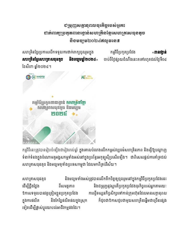 លើកទឹកចិត្តសហគ្រិនខ្មែរ​ដាក់ពាក្យប្រកួត«ពានរង្វាន់សហគ្រិនខ្មែរសហគ្រាសធុនតូច និងមធ្យម២០២៤» ដើម្បី​ជំរុញសក្កានុពលធុរកិច្ចរបស់ខ្លួន