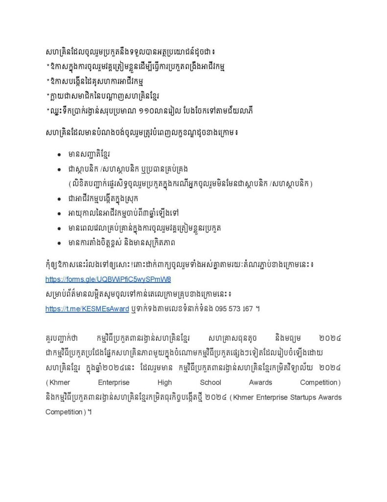 គួរបញ្ជាក់ថា កម្មវិធីប្រកួតពានរង្វាន់សហគ្រិនខ្មែរ សហគ្រាសធុនតូច និងមធ្យម ២០២៤ ជាកម្មវិធីប្រកួតប្រជែងផ្នែកសហគ្រិនភាពមួយក្នុងចំណោមកម្មវិធីប្រកួតផ្សេងៗទៀតដែលរៀបចំឡើងដោយ សហគ្រិនខ្មែរ ក្នុងឆ្នាំ២០២៤នេះ ដែលរួមមាន កម្មវិធីប្រកួតពានរង្វាន់សហគ្រិនខ្មែរកម្រិតវិទ្យាល័យ ២០២៤ (Khmer Enterprise High School Awards Competition) និងកម្មវិធីប្រកួតពានរង្វាន់សហគ្រិនខ្មែរកម្រិតធុរកិច្ចបង្កើតថ្មី ២០២៤ (Khmer Enterprise Startups Awards Competition)​៕ ផ្តល់សិទ្ធិដោយ៖ Fresh News