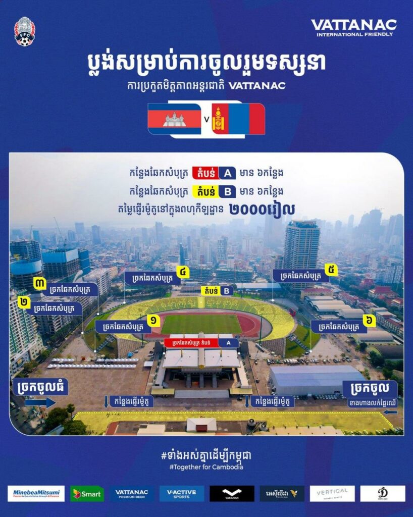 (ភ្នំពេញ)៖ ក្រុមជម្រើសជាតិកម្ពុជា ប៉ះម៉ុងហ្គោលី នឹងធ្វើចាប់ផ្តើមនាល្ងាចនេះ នៅពហុកីឡដ្ឋានជាតិអូឡាំពិក ដែលនេះជាប្រកួតមិត្តភាពអន្តរជាតិជើងទី១ រវាងក្រុមទាំង២ ខណៈសំបុត្រមានដាក់លក់ផ្ទាល់នៅមុខកីឡដ្ឋាន ដោយមានតម្លៃសំបុត្រមាន ២ប្រភេទ ដោយប្រភេទទី១ Zone A មានតម្លៃ ៣០,០០០ រៀល នឹងសំបុត្រប្រភេទ២ Zone B មានតម្លៃ ១៥,០០០ រៀល ដោយការប្រកួតធ្វើឡើងនាវេលាម៉ោង ៦:០០ល្ងាចនេះ។