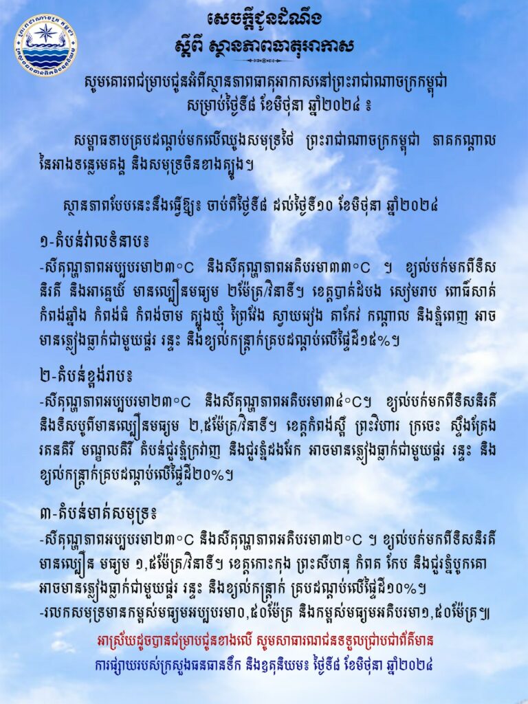 ក្រសួងបញ្ជាក់ថា សម្ពាធទាបគ្របដណ្ដប់មកលើឈូងសមុទ្រថៃ ព្រះរាជាណាចក្រកម្ពុជា ភាគកណ្តាលនៃអាងទន្លេមេគង្គ និងសមុទ្រចិនខាងត្បូង។ ស្ថានភាពបែបនេះនឹងធ្វើឱ្យ៖ ចាប់ពីថ្ងៃទី៨ ដល់ថ្ងៃទី១០ ខែមិថុនា ឆ្នាំ២០២៤ អាកាសធាតុមានលក្ខណៈដូចខាងក្រោម៖