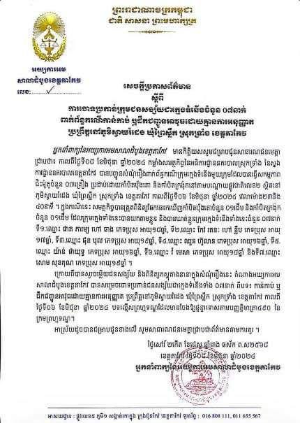 (តាកែវ)៖ ក្មេងទំនើងចំនួន៧នាក់ ដែលបានធ្វើសកម្មភាពជិះម៉ូតូកាន់កាំបិតប៉័ងតោ នៅតាមដងជាតិលេខ២ ត្រូវបានតំណាងអយ្យការអមសាលាដំបូងខេត្តតាកែវ ចោទប្រកាន់ពាក់ព័ន្ធទៅនឹងករណីកាន់កាប់ ឬដឹកជញ្ជូនអាវុធដោយគ្មានការអនុញ្ញាតប្រព្រឹត្តនៅក្នុងភូមិស្វាយរំដេង ឃុំព្រៃស្លឹក ស្រុកទ្រាំង ខេត្តតាកែវ។