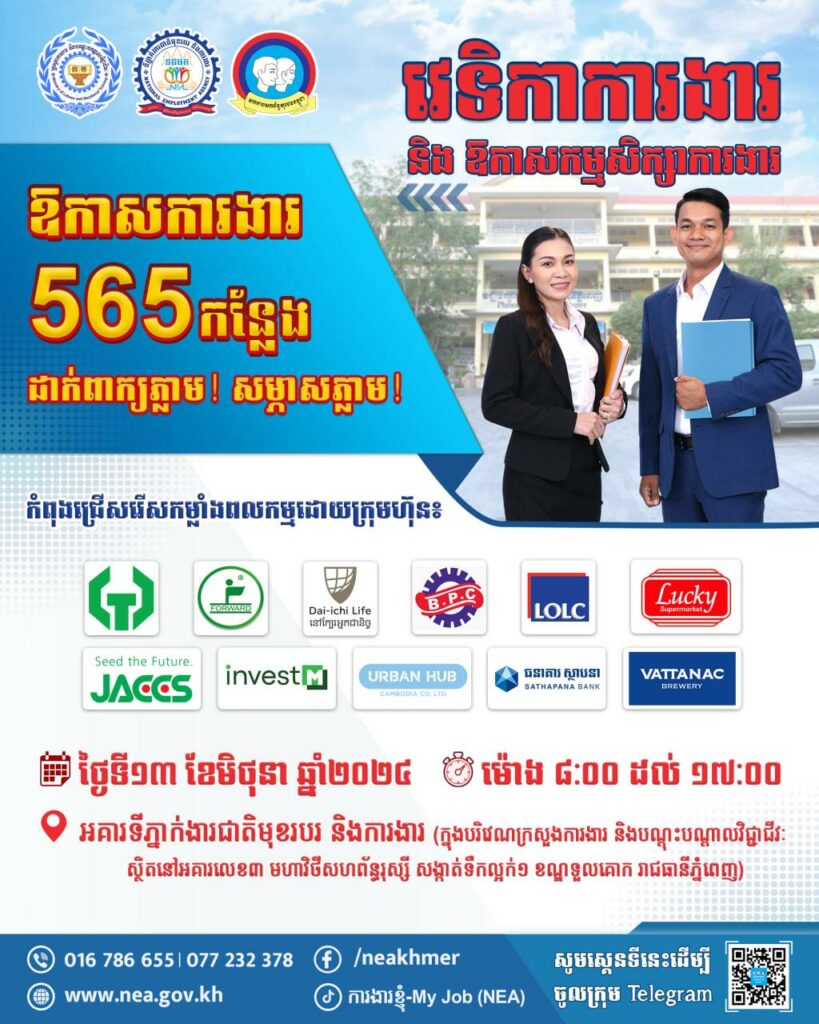 (ភ្នំពេញ)៖ ឱកាសការងារថ្មីបន្ថែមទៀតសរុប ៥៦៥ កន្លែង នឹងត្រូវផ្តល់ជូនយុវជន សិស្ស/និស្សិត និងអ្នកស្វែងរកការងារនៅក្នុងវេទិកាការងារប្រចាំខែ ដែលរៀបចំដោយទីភ្នាក់ងារជាតិមុខរបរ និងការងារ (NEA) នៃក្រសួងការងារ និងបណ្តុះបណ្តាលវិជ្ជាជីវៈ សហការជាមួយ ស.ស.យ.ក. វិស័យការងារ និងបណ្តុះបណ្តាលវិជ្ជាជីវៈ នាថ្ងៃទី១៣ ខែមិថុនា ឆ្នាំ២០២៤ ខាងមុខនេះ។