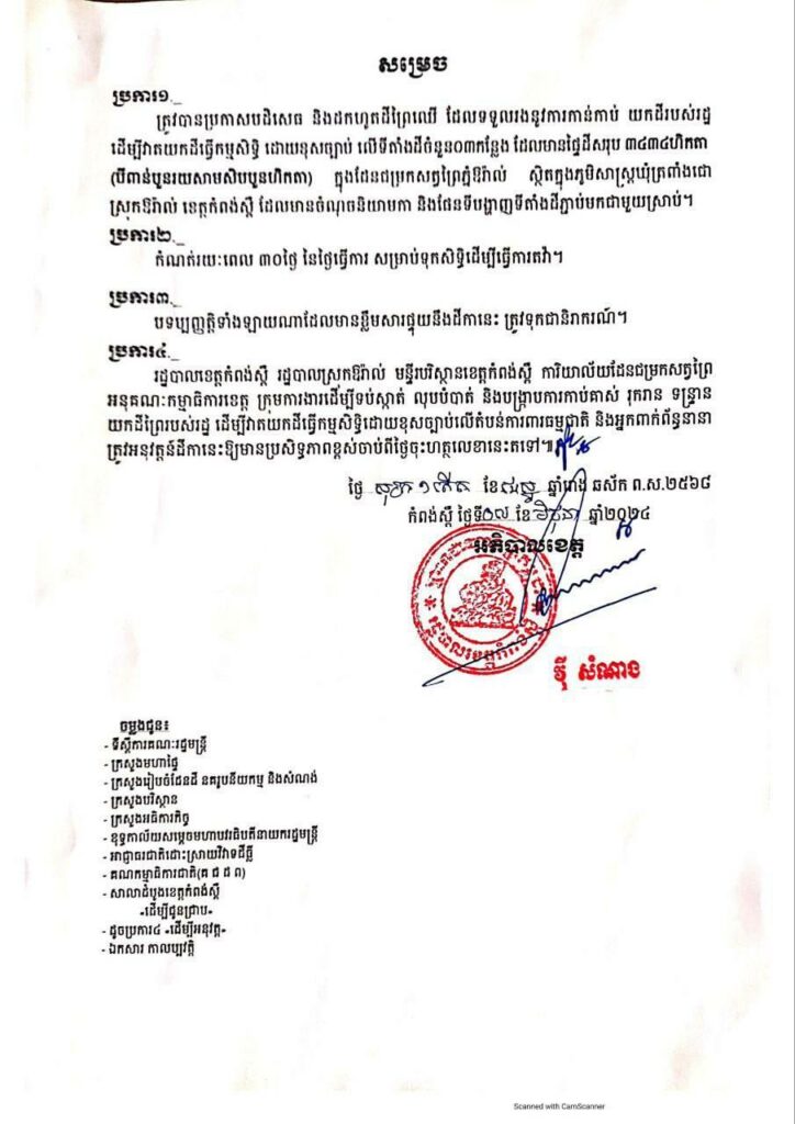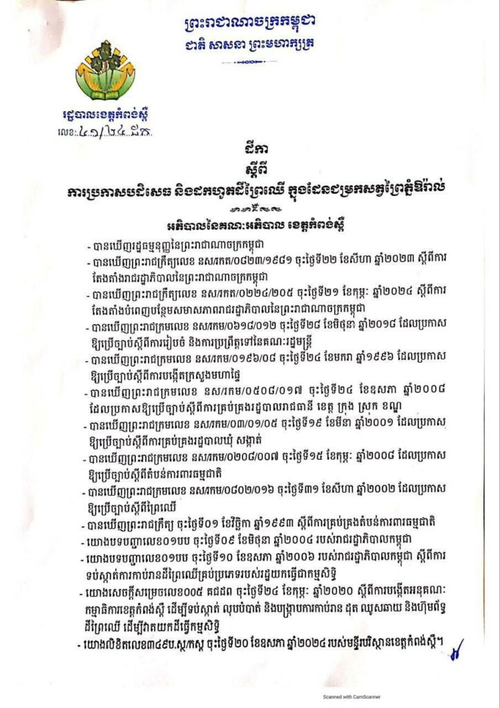 (កំពង់ស្ពឺ)៖ លោក វ៉ី សំណាង អភិបាលខេត្តកំពង់ស្ពឺ បានប្រកាសបដិសេធ និងដកហូតដីព្រៃក្នុងដែនជម្រកសត្វព្រៃភ្នំឱរ៉ាល់ ដែលទទួលរងនូវការកាន់កាប់យកដីរបស់រដ្ឋ ដើម្បីវាតទីយកដីធ្វើជាកម្មសិទ្ធិដោយខុសច្បាប់ លើទីតាំងចំនួន៣កន្លែង ដែលមានផ្ទៃដី៣៤៣៤ហិកតា ស្ថិតក្នុងឃុំត្រពាំងជោ ស្រុកឱរ៉ាល់ ខេត្តកំពង់ស្ពឺ។ នេះបើតាមដីការបស់អភិបាលខេត្តកំពង់ស្ពឺ ដែលបណ្ដាញព័ត៌មាន Fresh News ទទួលបាននៅព្រឹកថ្ងៃទី១២ ខែមិថុនា ឆ្នាំ២០២៤។