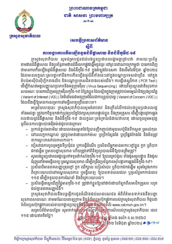 (ភ្នំពេញ)៖ នៅរសៀលថ្ងៃទី១២ ខែមិថុនា ឆ្នាំ២០២៤នេះ ក្រសួងសុខាភិបាល ចេញសេចក្តីប្រកាសព័ត៌មាន ស្តីពីការបង្ការការកើនឡើងនូវជំងឺផ្តាសាយ និងជំងឺកូវីដ១៩។ ផ្តល់សិទ្ធិដោយ Fresh News