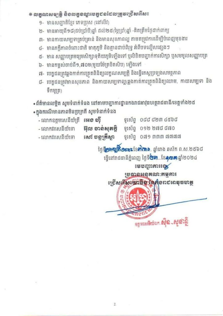 ៨- បេក្ខជនត្រូវមានសុខភាព និងកាយសម្បទាល្អ(ឆ្លងកាត់ការត្រួតពិនិត្យឈាម កាយសម្បទា និង ទឹកមូត្រ)៕ ផ្តល់សិទ្ធិដោយ៖ Fresh News
