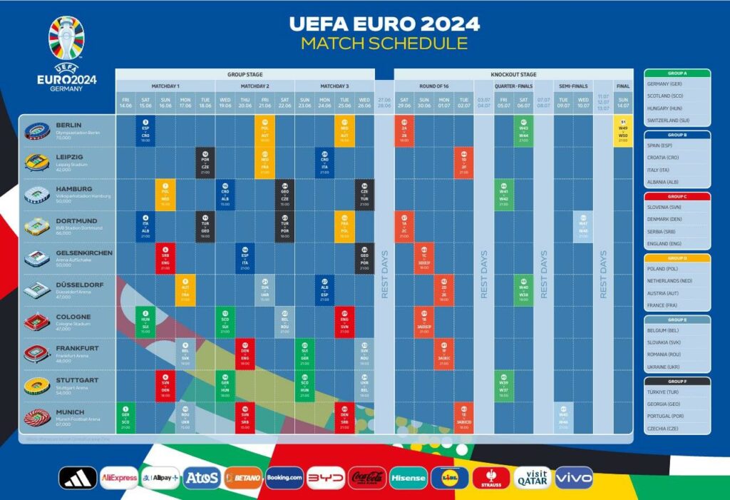 ពេលវេលាជំនួបប្រកួតតាមពូល Euro 2024 ម៉ោងនៅក្នុងតំបន់ដែលអាល្លឺម៉ង់ ធ្វើម្ចាស់ផ្ទះ