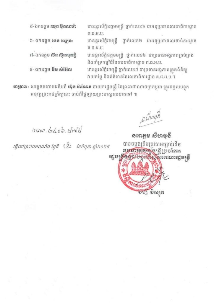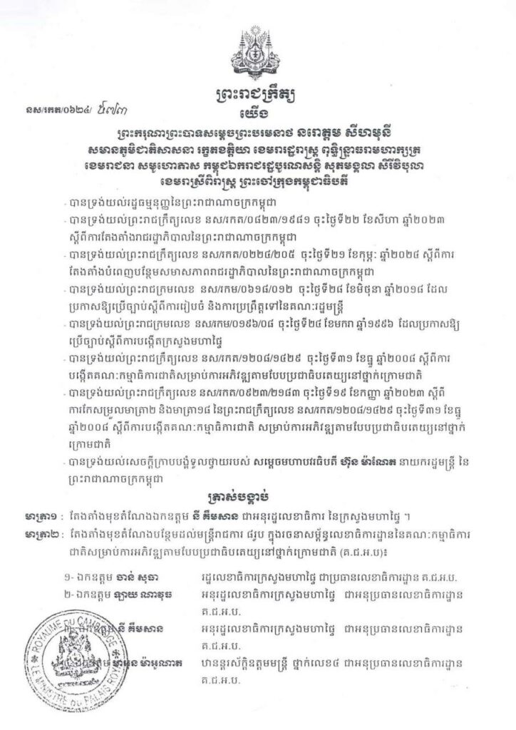 ព្រះមហាក្សត្រ ចេញព្រះរាជក្រឹត្យ តែងតាំងអនុរដ្ឋលេខាធិការ និងតែងតាំងមុខតំណែងបន្ថែមដល់មន្ត្រីរាជការ៨រូប នៃក្រសួងមហាផ្ទៃ
