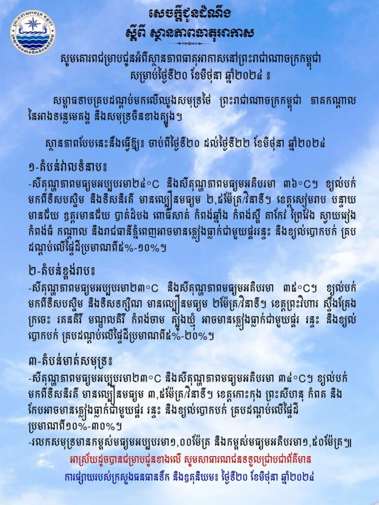ក្រសួងធនធានទឹក ជូនដំណឹងអំពីស្ថានភាពធាតុអាកាសនៅកម្ពុជា សម្រាប់ថ្ងៃទី២០ ខែមិថុនា ឆ្នាំ២០២៤