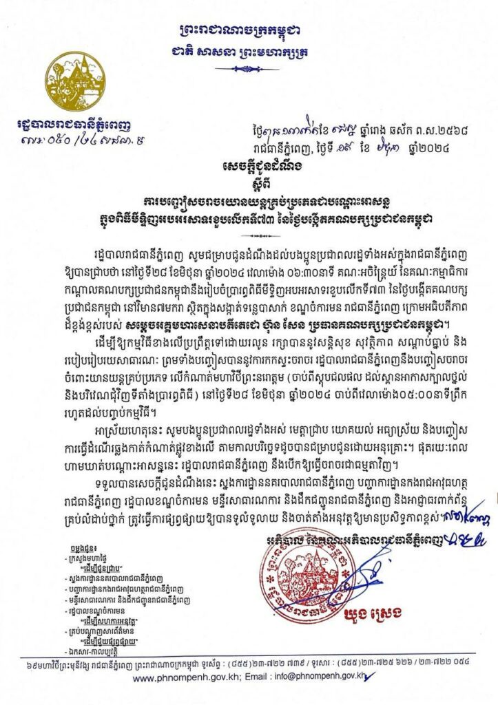 រដ្ឋបាលរាជធានីភ្នំពេញ ជូនដំណឹងពីការបញ្ចៀសចរាចរ យានយន្តគ្រប់ប្រភេទជាបណ្ដោះអាសន្ន ក្នុងពិធីមីទ្ទិញអបអរសាទរ ខួបលើកទី៧៣ នៃថ្ងៃបង្កើតគណបក្សប្រជាជនកម្ពុជា