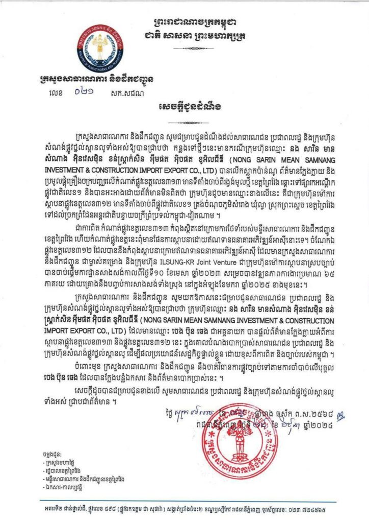 (ភ្នំពេញ)៖ ក្រសួងសាធារណការ និងដឹកជញ្ជូន បានចេញសេចក្តីជូនដំណឹងអះអាងថា ក្រុមហ៊ុនឈ្មោះ នង សារិន មាន សំណាង អ៉ិនវេសម៉ិន ខន់ស្ត្រាក់សិន អ៉ីមផត អិចផត ខូអិលធីឌី (NONG SARIN MEAN SAMNANG INVESTMENT & CONSTRUCTION IMPORT EXPORT CO., LTD) មិនមែនជាក្រុមហ៊ុនម៉ៅការស្ថាបនាផ្លូវខេត្តលេខ៣១២ មានទីតាំងចាប់ពីផ្លូវជាតិលេខ១ ត្រង់ចំណុចភូមិសំរោង ឃុំល្វា ស្រុកព្រះស្តេច ខេត្តព្រៃវែង ទៅដល់ច្រកព្រំដែនអន្តរជាតិបន្ទាយចក្រីព្រំប្រទល់កម្ពុជា-វៀតណាម នោះទេ។