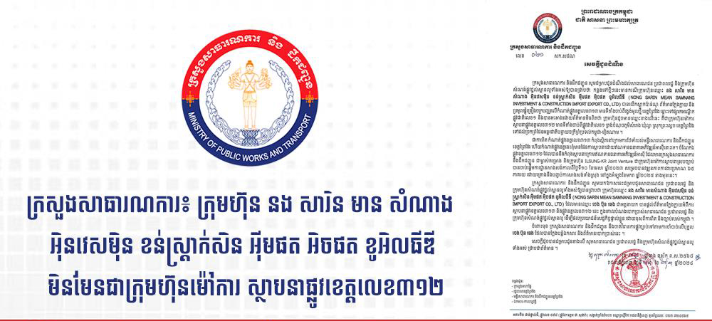 ក្រសួងសាធារណការ សូមជម្រាបជូនសាធារណជន ប្រជាពលរដ្ឋ និងក្រុមហ៊ុនសំណង់ផ្លូវថ្នល់ស្ពានលូទាំងអស់ឱ្យបានជ្រាបថា ក្រុមហ៊ុនឈ្មោះ នង សារិន មានសំណាង អ៉ិនវេសម៉ិន ខន់ ស្ត្រាក់សិន អ៉ីមផត អិចផត ខូអិលធីឌី (NONG SARIN MEAN SAMNANG INVESTMENT & CONSTRUCTION IMPORT EXPORT CO., LTD) ដែលមានឈ្មោះ ចេង ប៊ុន ឆេង ជាអគ្គនាយក បានផ្តល់ព័ត៌មានក្លែងក្លាយអំពីការស្ថាបនាផ្លូវខេត្តលេខ៣១៣ និងផ្លូវខេត្តលេខ៣១២ នេះ ក្នុងគោលបំណង បោកប្រាស់សាធារណជន ប្រជាពលរដ្ឋ និងក្រុមហ៊ុនសំណង់ផ្លូវថ្នល់ស្ពានលូ ដើម្បីផលប្រយោជន៍សេដ្ឋកិច្ចផ្ទាល់ខ្លួន ដោយខុសពីការពិត និងច្បាប់របស់កម្ពុជា ។