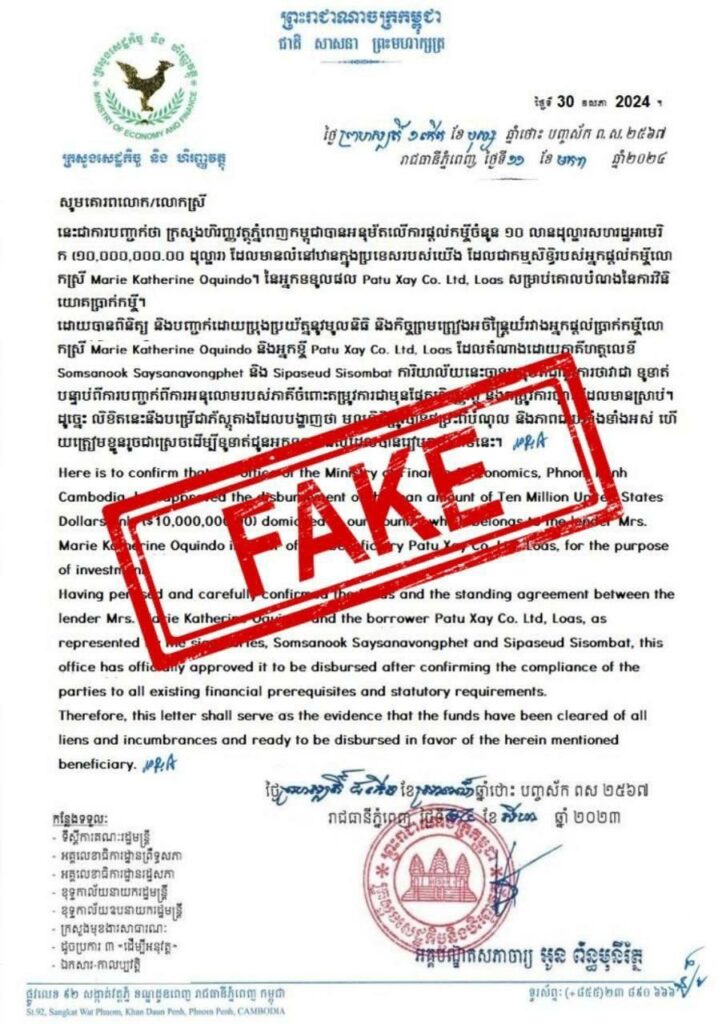 ក្រសួងសេដ្ឋកិច្ច ច្រានចោលលិខិតក្លែងក្លាយ ដែលលើកឡើងពីការអនុម័តផ្តល់កម្ចី ១០លានដុល្លារ ទៅឱ្យក្រុមហ៊ុនមួយ