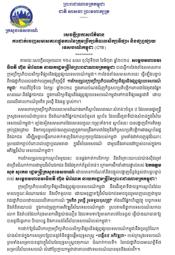 ការចេញសេចក្ដីប្រកាសព័ត៌មាននេះ គឺបន្ទាប់ពីមានសេចក្តីសម្រេចលេខ ១២៤ សសរ ចុះថ្ងៃទី២៧ ខែមិថុនា ឆ្នាំ២០២៤ របស់សម្តេចមហាបវរធិបតី ហ៊ុន ម៉ាណែត នាយករដ្ឋមន្រ្តីនៃកម្ពុជា ដែលបានតែងតាំងសមាសភាពក្រុមប្រឹក្សាភិបាលសិក្សាទីផ្សារ និងផ្សព្វផ្សាយទេសចរណ៍កម្ពុជា។