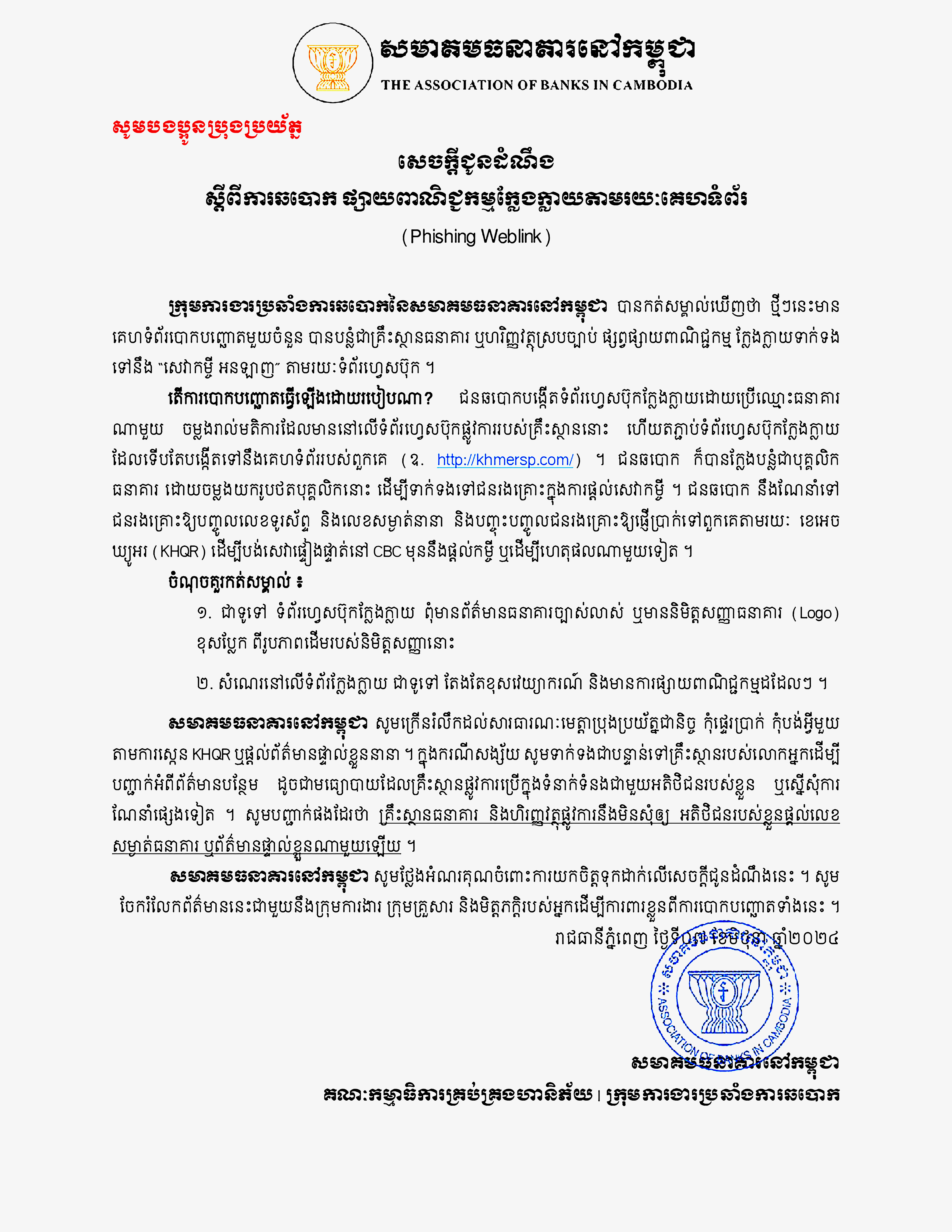 សមាគមធនាគារនៅកម្ពុជា ក៏បានចេញ សេចក្តីជូនដំណឹងមួយកាលពីថ្ងៃទី ៧ ខែមិថុនា ឆ្នាំ២០២៤ ថ្មីៗនេះដើម្បីឱ្យសាធារណៈជនប្រុងប្រយ័ត្នខ្ពស់ និងបញ្ជាក់ច្បាស់ថា គ្រឹះស្ថានធនាគារ និងហិរញ្ញវត្ថុស្របច្បាប់និងផ្លូវការ មិនមានគោលការណ៍សុំឲ្យអតិថិជនរបស់ខ្លួនផ្តល់លេខសម្ងាត់ធនាគារ ឬផ្តល់ព័ត៌មានផ្ទាល់ខ្លួនណាមួយឡើយ ។
