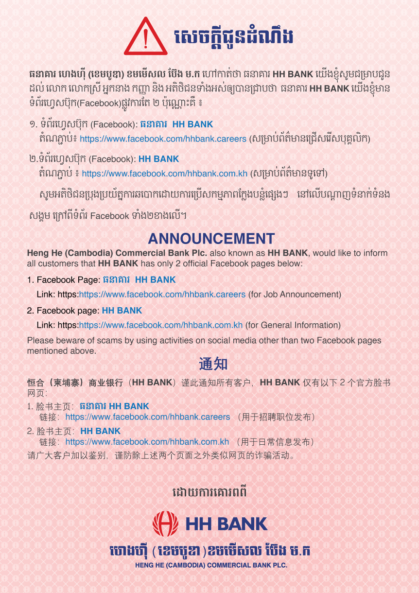 គួរបញ្ជាក់ផងដែរថា ទំព័រហ្វេសប៊ុកផ្លូវការរបស់ធនាគារ HH BANK គឺមានឈ្មោះថា HH BANK (https://www.facebook.com/hhbank.com.kh) ឬ ធនាគារ HH BANK (https://www.facebook.com/hhbank.careers)និងគេហទំព័រ(វែបសាយ)គឺ hhbank.com.kh រីឯលេខទូរសព្ទ ទំនាក់ទំនងគឺមានតែ មួយខ្សែតែប៉ុណ្ណោះគឺ 023 99 7777 ៕