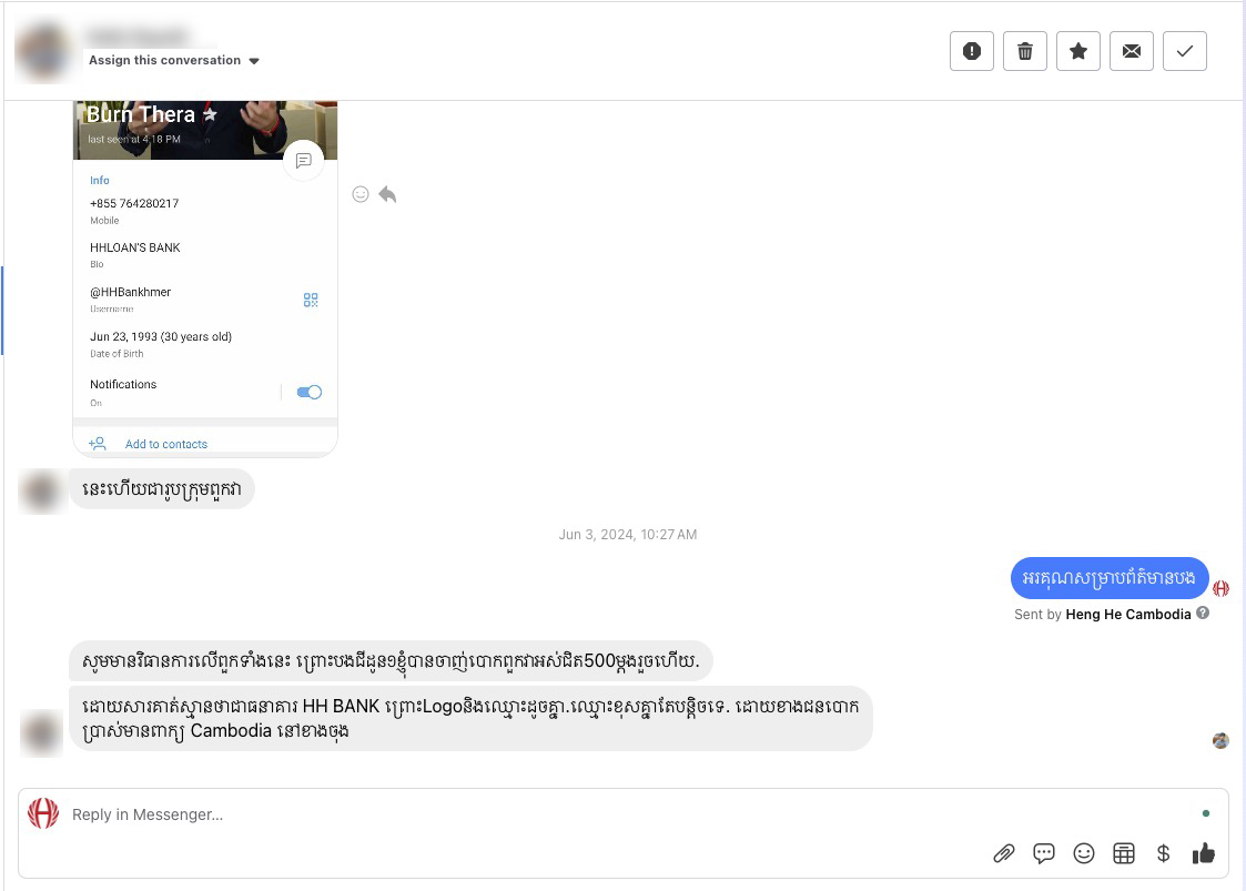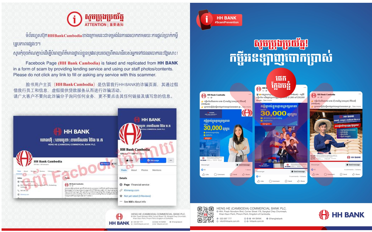 ធនាគារ HH BANK ក្រើនរំលឹកពលរដ្ឋខ្មែរ ឱ្យប្រុងប្រយ័ត្នខ្ពស់ចំពោះការឆបោកលើបណ្តាញហ្វេសប៊ុកតាមរយៈការផ្តល់កម្ចីក្លែងក្លាយ