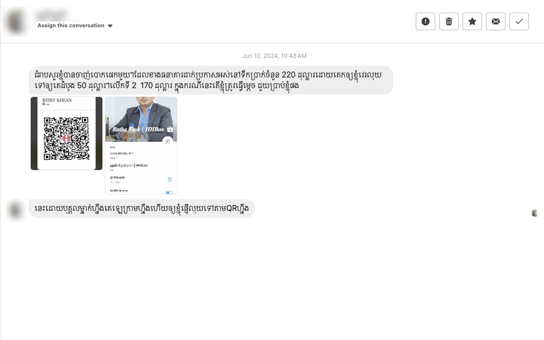 លោកបានបន្ថែមថា «យើងទទួលបានការរាយការណ៍តាមបណ្តាញ Facebook ផ្លូវការរបស់យើង ដោយមានជនរងគ្រោះខ្លះត្រូវបានជនឆបោក បោកប្រាស់អស់រាប់ពាន់ដុល្លា និងមានជនរងគ្រោះមួយចំនួនបានមកដល់ទីស្នាក់ការផ្ទាល់របស់ធនាគារ ហើយយើងបានសម្របសម្រួលឱ្យជនរងគ្រោះធ្វើការដាក់ពាក្យបណ្តឹងទៅកាន់អាជ្ញាធរមានសមត្ថកិច្ច ក៏ដូចជានាយកដ្ឋានប្រឆាំងបទល្មើសបច្ចេកវិទ្យាផងដែរ» ។