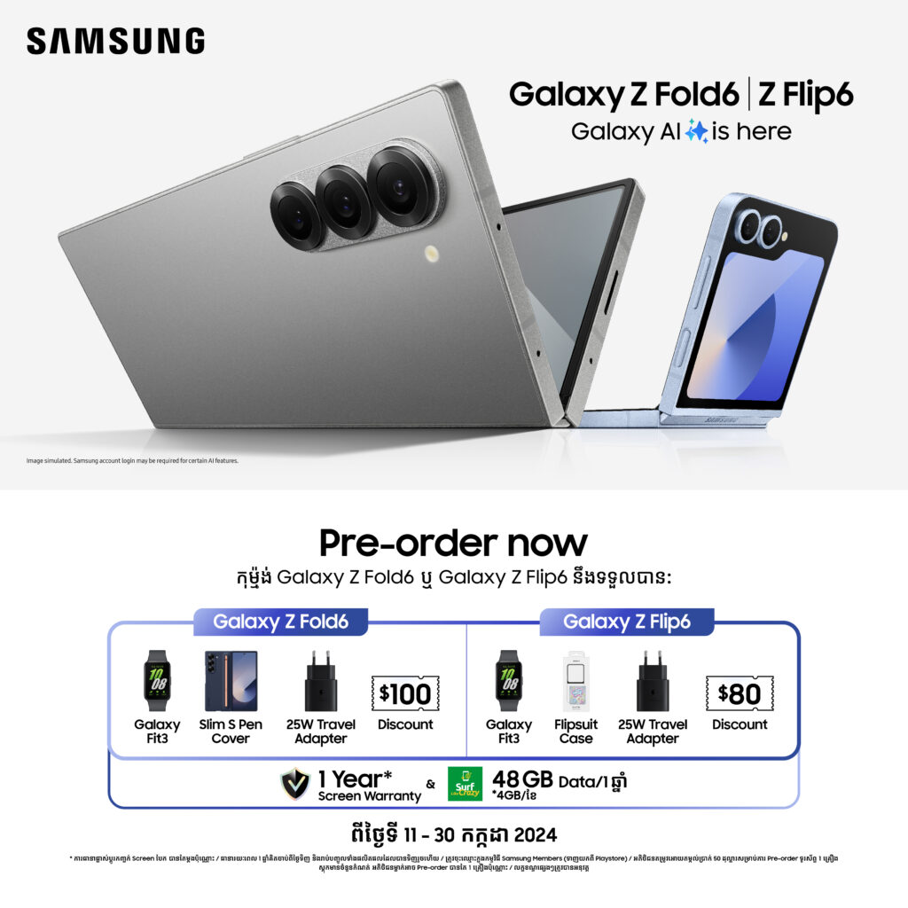 សម្រាប់ព័ត៌មានលម្អិតបន្ថែមសូមអញ្ជើញមកទស្សនាផលិតផលដោយផ្ទាល់ ឬតេស្តដោយផ្ទាល់នៅ” Galaxy Pop Up Store” ដែលមានទីតាំងនៅក្នុងផ្សារទំនើប Chip Mong 271 Mega Mall ជាន់ផ្ទាល់ដីចាប់ពីថ្ងៃទី 11 ខែកក្កដា រហូតដល់ថ្ងៃទី 28 ខែកក្កដា ឆ្នាំ 2024 ឬនៅតាមហាងទំនើបចែកចាយផលិតផល សាមសុង ទាំងអស់ដែលនៅជិតលោកអ្នកបំផុតទូទាំងប្រទេស ឬក៏អាចចូលទៅកាន់ Facebook: SamsungCambodia, IG: samsungcambodia, TikTok: samsungcambodia ឬ ក៏អាចធ្វើការទំនាក់ទំនងទៅកាន់ផ្នែកសេវាបម្រើអតិថិជន 24/7 ឥតគិតថ្លៃតាមរយៈទូរសព្ទលេខ៖ 1800-20 32 32!
