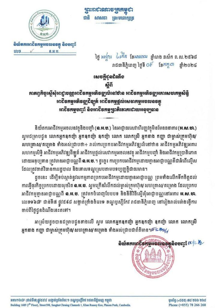 (ភ្នំពេញ)៖ និយ័តករអាជីវកម្មអចលនវត្ថុ និងបញ្ចាំ (ន.អ.ប.) នៃអាជ្ញាធរសេវាហិរញ្ញវត្ថុមិនមែនធនាគារ បានចេញសេចក្តីជូនដំណឹងថ្មីមួយ ដោយអំពាវនាវដល់ម្ចាស់អាជីវកម្មអភិវឌ្ឍលំនៅឋាន អាជីវកម្មអភិវឌ្ឍអគារ សហកម្មសិទ្ធិ អាជីវកម្មអភិវឌ្ឍដីឡូត៍ អាជីវកម្មផ្តល់សេវាកម្មអចលនវត្ថុ អាជីវកម្មបញ្ចាំ និងអាជីវកម្មប្រាតិភោគ ដោយអនុប្បទាន ដែលកំពុងធ្វើអាជីវកម្មដោយគ្មានអាជ្ញាបណ្ណ ត្រូវមកបំពេញបែបបទ និងនីតិវិធីស្នើសុំអាជ្ញាបណ្ណ ឱ្យបានត្រឹមត្រូវ។