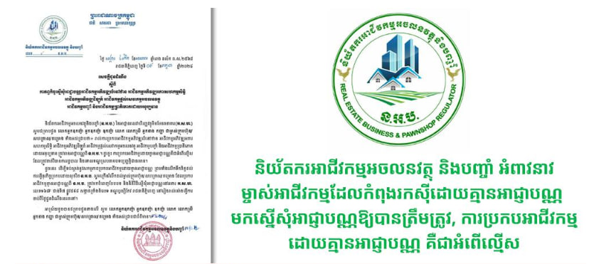និយ័តករអាជីវកម្មអចលនវត្ថុ និងបញ្ចាំ បញ្ជាក់ថា ការប្រកបអាជីវកម្មដោយគ្មានអាជ្ញាបណ្ណគឺជាអំពើល្មើស ដែលត្រូវចាត់វិធានការរដ្ឋបាល និងទោសទណ្ឌស្របតាមបទប្បញ្ញត្តិជាធរមាន។