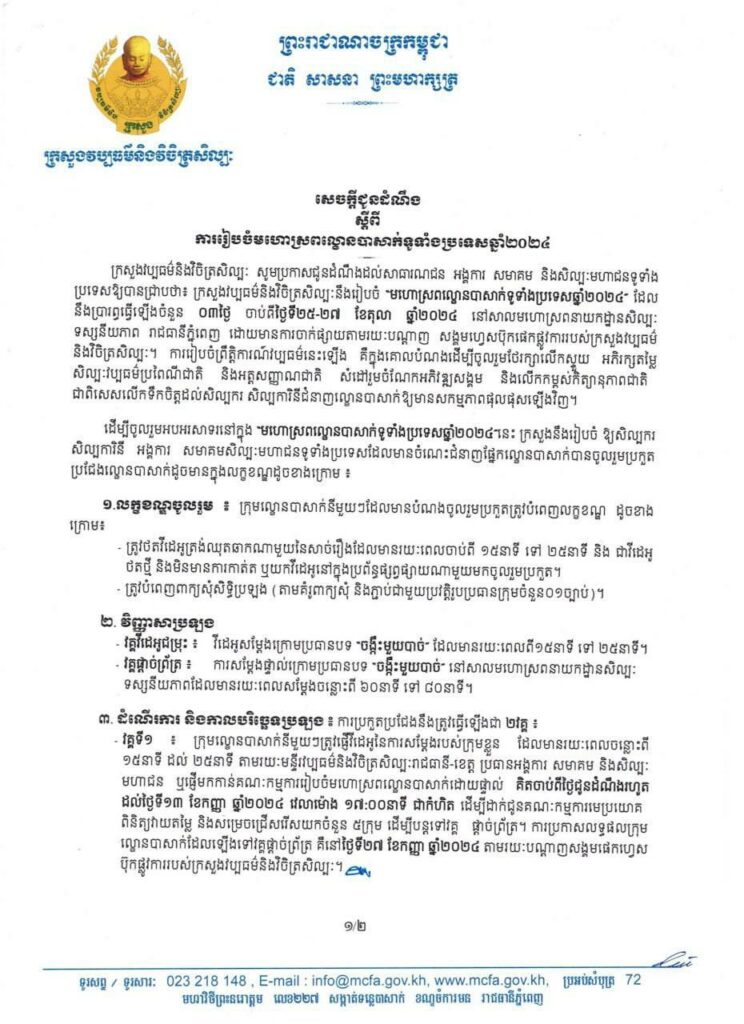 ក្រសួងវប្បធម៌ ជូនដំណឹងសិល្បករ-សិល្បការិនី ដែលចង់ប្រឡងប្រជែងកម្មវិធី «មហោស្រពល្ខោនបាសាក់ទូទាំងប្រទេស ឆ្នាំ២០២៤» សូមមកដាក់ពាក្យ !