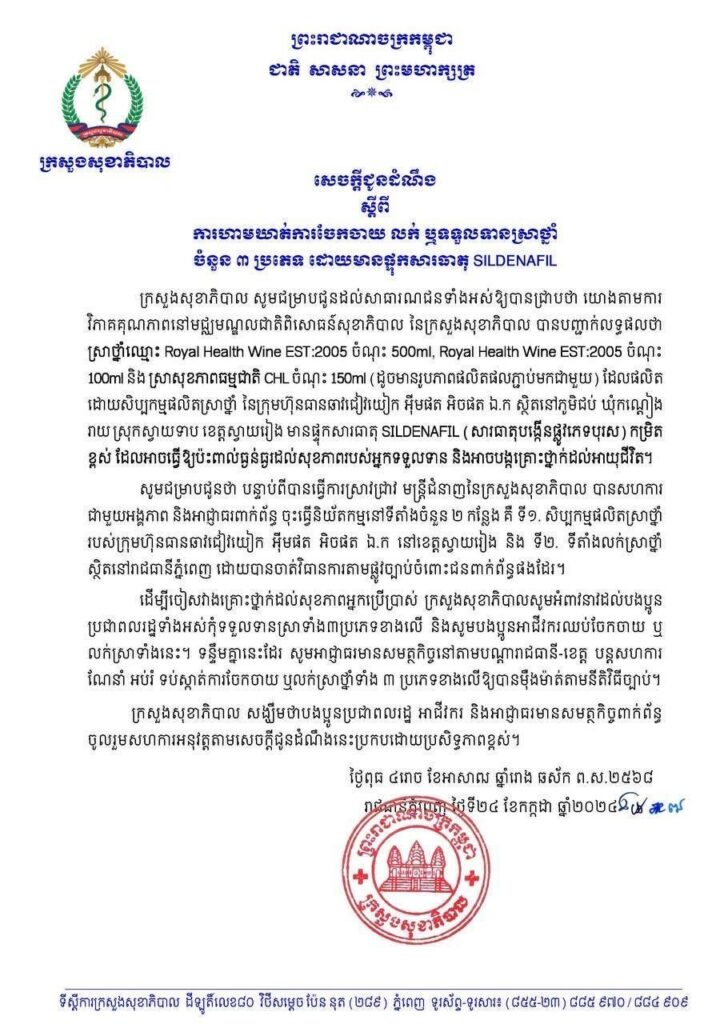 ក្រសួងសុខាភិបាល ជូនដំណឹង ស្តីពីការហាមឃាត់ការចែកចាយ លក់ ឬទទួលទានស្រាថ្នាំ ចំនួន៣ប្រភេទ ដោយមានផ្ទុកសារធាតុ SILDENAFIL