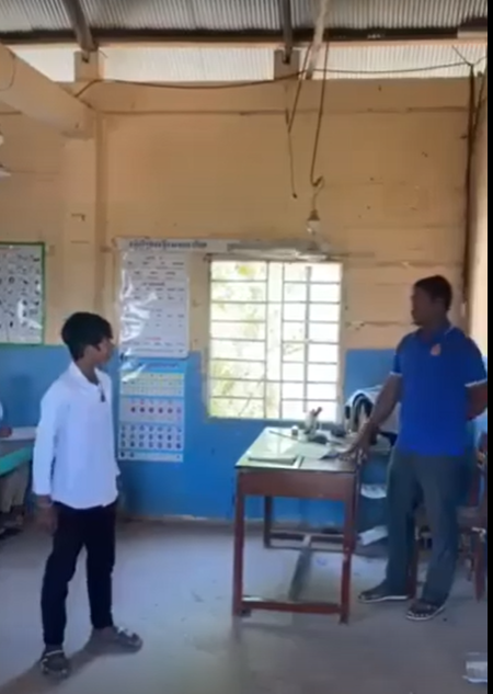 យោងតាមរបាយការណ៍របស់នាយកសាលា បានឲ្យដឹងថា សិស្សប្រុសម្នាក់នេះឈ្មោះ រី សុវណ្ណ អាយុ១៣ឆ្នាំ មានឪពុកឈ្មោះ វុត វី ជាកសិករ ម្តាយឈ្មោះ ប៉ក់ ទុំ ជាអ្នកលក់ដូរនៅក្នុងភូមិថ្មី ឃុំកំពង់អុស ស្រុកជល់គិរី ខេត្តកំពង់ឆ្នាំង បានប្រើឥរិយាបថមិនសមរម្យចំពោះគ្រូដោយសិស្សរត់មក ធាក់តុគ្រូហើយចង់វាយគ្រូ។
