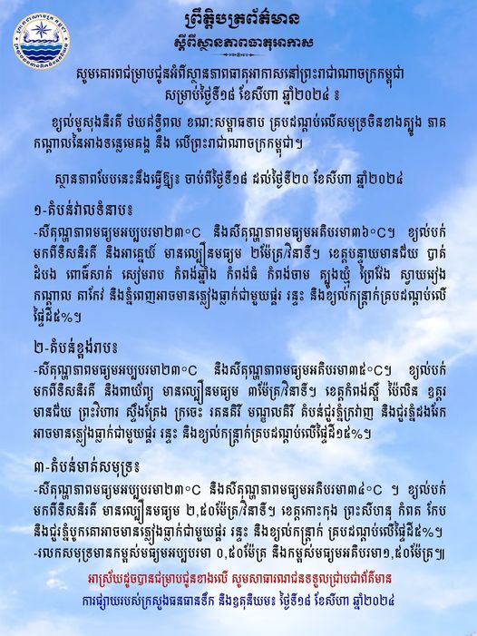 ក្រសួងធនធានទឹក ជូនដំណឹងអំពីស្ថានភាពធាតុអាកាសនៅកម្ពុជា សម្រាប់ថ្ងៃទី១៨ ខែសីហា ឆ្នាំ២០២៤