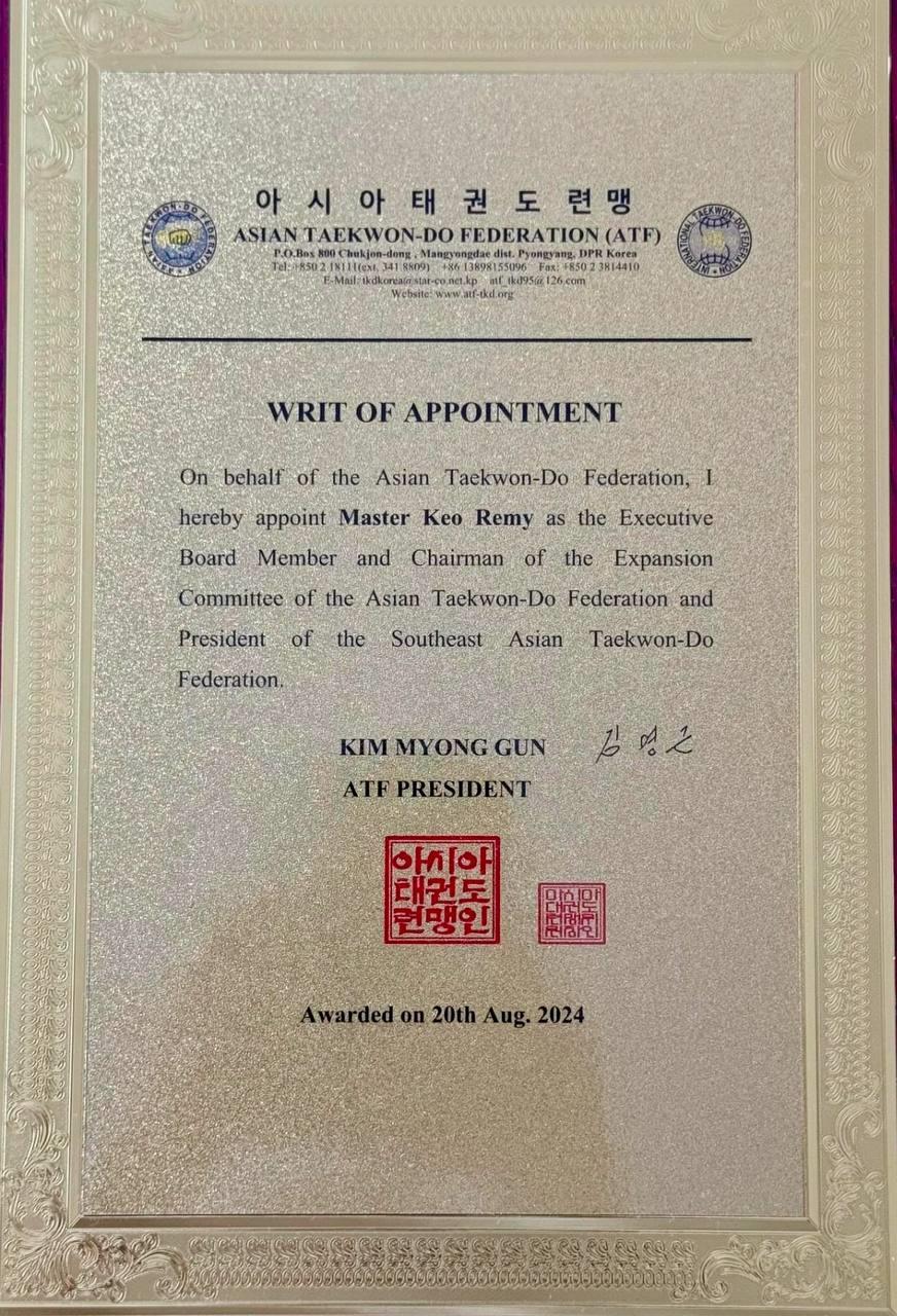 លោក កែវ រ៉េមី បន្ដជាប់ជាប្រធានសហព័ន្ធកីឡាតេក្វាន់ដូ ITF អាស៊ីអាគ្នេយ៍ និងបន្ថែមតួនាទីថ្មីនៅ ATF
