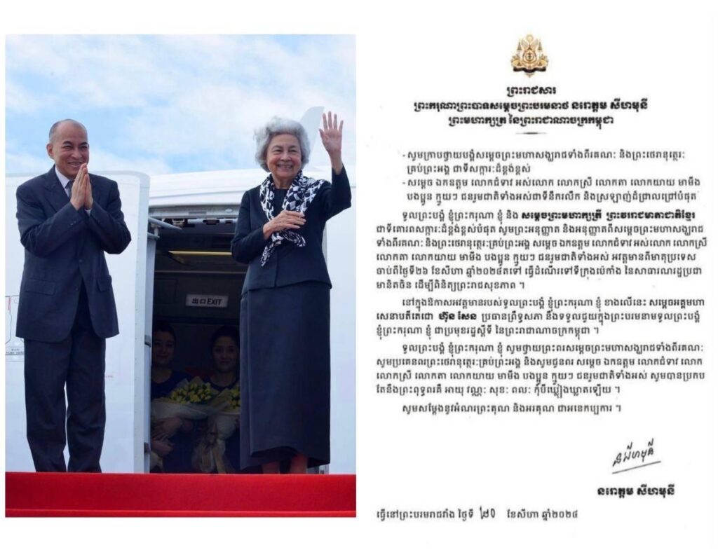 (ភ្នំពេញ)៖ ព្រះករុណា ព្រះបាទ សម្តេចព្រះ បរមនាថ នរោត្តម សីហមុនី ព្រះមហាក្សត្រនៃកម្ពុជា និងសម្តេចព្រះមហាក្សត្រី នរោត្តម មុនិនាថ សីហនុ ព្រះវររាជមាតាជាតិខ្មែរ ជាទីគោរពសក្ការៈដ៏ខ្ពង់ខ្ពស់បំផុត ព្រះអង្គទាំងទ្វេ នឹងស្តេចយាងទៅពិនិត្យព្រះរាជសុខភាព នៅសាធារណរដ្ឋប្រជាមានិតចិន នាព្រឹកថ្ងៃទី២៦ ខែសីហា ឆ្នាំ២០២៤ ស្អែកនេះ។