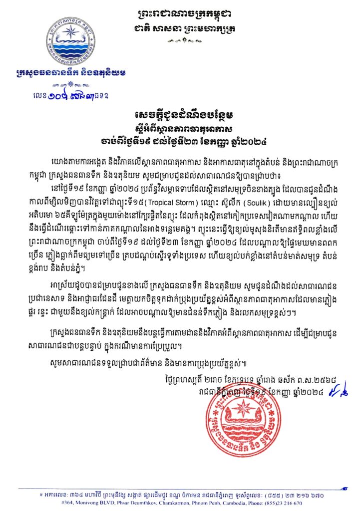 នៅក្នុងសេចក្ដីជូនដំណឹង ក្រសួងបានបញ្ជាក់ឱ្យដឹងថា ដោយយោងតាមការអង្កេត និងវិភាគលើស្ថានភាពធាតុអាកាស និងអាកាសធាតុនៅក្នុងតំបន់ និងព្រះរាជាណាចក្រ កម្ពុជា នៅថ្ងៃទី១៩ ខែកញ្ញា ឆ្នាំ២០២៤ ប្រព័ន្ធវិសម្ពាធទាបដែលស្ថិតនៅសមុទ្រចិនខាងត្បូង ដែលបានជូនដំណឹង កាលពីម្សិលមិញបានវិវត្តទៅជាព្យុះទី១៥ (Tropical Storm) ឈ្មោះ ស៊ូលីក (Soulik) ដោយមានល្បឿនខ្យល់ អតិបរមា ៦៥គីឡូម៉ែត្រក្នុងមួយម៉ោងនៅក្បែរផ្ចិតនៃព្យុះ ដែលកំពុងស្ថិតនៅកៀកប្រទេសវៀតណាមកណ្តាល ហើយ នឹងធ្វើដំណើរឆ្ពោះទៅកាន់ភាគកណ្តាលនៃអាងទន្លេមេគង្គ។ ព្យុះនេះធ្វើឱ្យខ្យល់មូសុងនិរតីមានឥទ្ធិពលខ្លាំងលើ ព្រះរាជាណាចក្រកម្ពុជា ចាប់ពីថ្ងៃទី១៩ ដល់ថ្ងៃទី២៣ ខែកញ្ញា ឆ្នាំ២០២៤ ដែលបណ្តាលឱ្យផ្ទៃមេឃមានពពក ច្រើន ភ្លៀងធ្លាក់ពីមធ្យមទៅច្រើន គ្របដណ្តប់ស្ទើរទូទាំងប្រទេស ហើយខ្យល់បក់ខ្លាំងនៅតំបន់មាត់សមុទ្រ តំបន់ ខ្ពង់រាប និងតំបន់ភ្នំ។