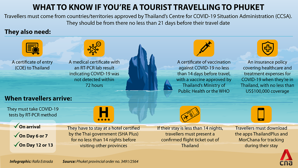 អ្នកទេសចរណ៍នឹងតម្រូវឱ្យមានសំបុត្របញ្ជាក់ (COE) ពីស្ថានទូតថៃប្រចាំការនៅប្រទេសរបស់ពួកគេនីមួយៗ បន្ទាប់មកក្នុងរយៈពេល ៧២ ម៉ោងមុនពេលហោះហើរទៅប្រទេសថៃ ពួកគេត្រូវទទួលក្រដាសបញ្ជាក់ពីលទ្ធផលនៃការធ្វើតេស្តអវិជ្ជមានជំងឺ COVID-19 ។ កុមារដែលមានអាយុក្រោម ៦ឆ្នាំ ដែលធ្វើដំណើរជាមួយឪពុកម្តាយអាចចូលខេត្ត ដោយមិនចាំបាច់ចាក់វ៉ាក់សាំងការពារក៏បាន។ ចំណែកការធានារ៉ាប់រងចំពោះសុខភាព និងការព្យាបាលជំងឺ COVID-19 យ៉ាងហោចណាស់ ១០០,០០០ ដុល្លារអាមេរិក នឹងត្រូវបានទាមទារឱ្យមានជាចាំបាច់ នៅពេលពួកគេស្នាក់នៅក្នុងប្រទេសថៃ៕