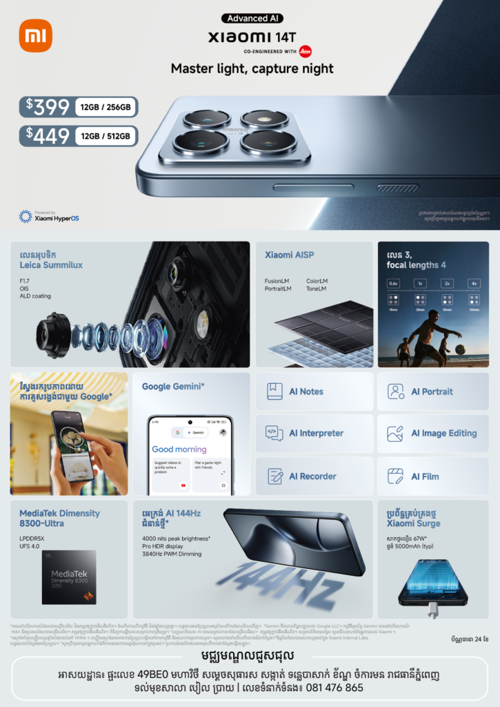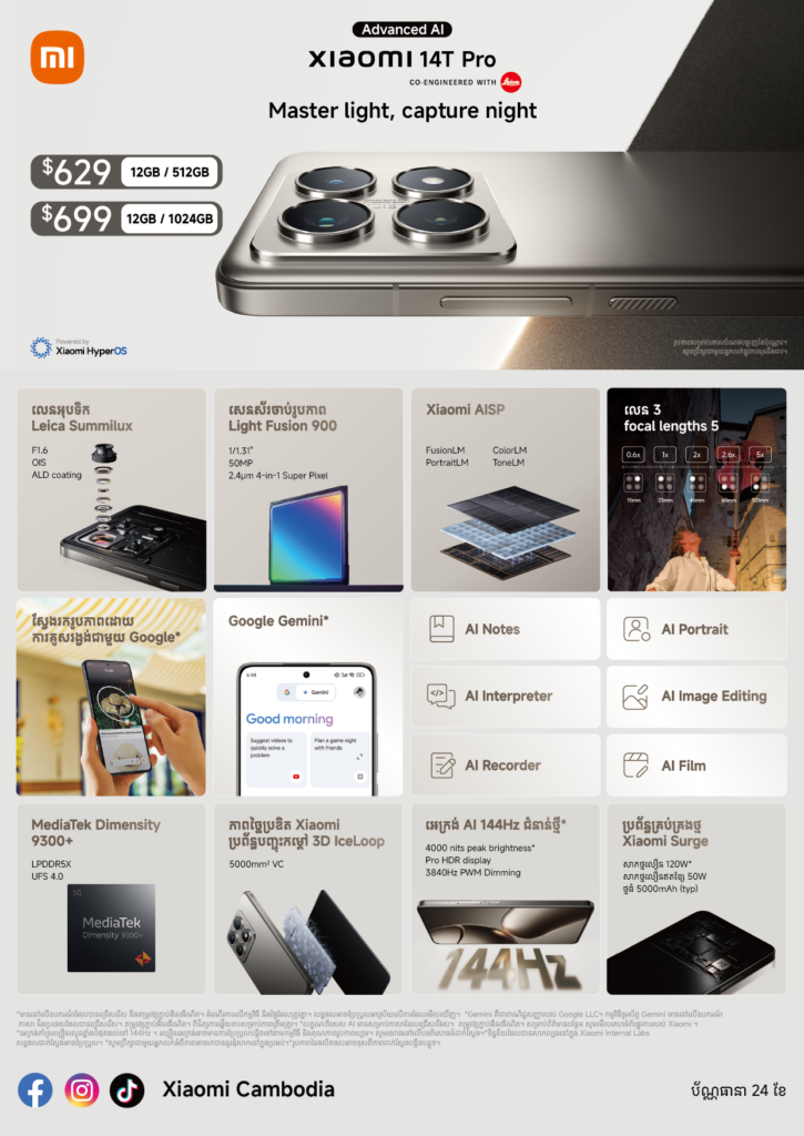 Mogan Tower, ភ្នំពេញ, ថ្ងៃទី 10 ខែតុលា ឆ្នាំ 2024 ៖ Xiaomi មានមោទនភាពក្នុងការដាក់បង្ហាញ ត្រកូលស្មាតហ្វូនចុងក្រោយបំផុតរបស់ខ្លួនគឺ Xiaomi 14T Series ដែលរចនាឡើងសម្រាប់អ្នកចូលចិត្តថតរូប ដែលស្វែងរកសមត្ថភាពថតរូបកម្រិតកំពូល។