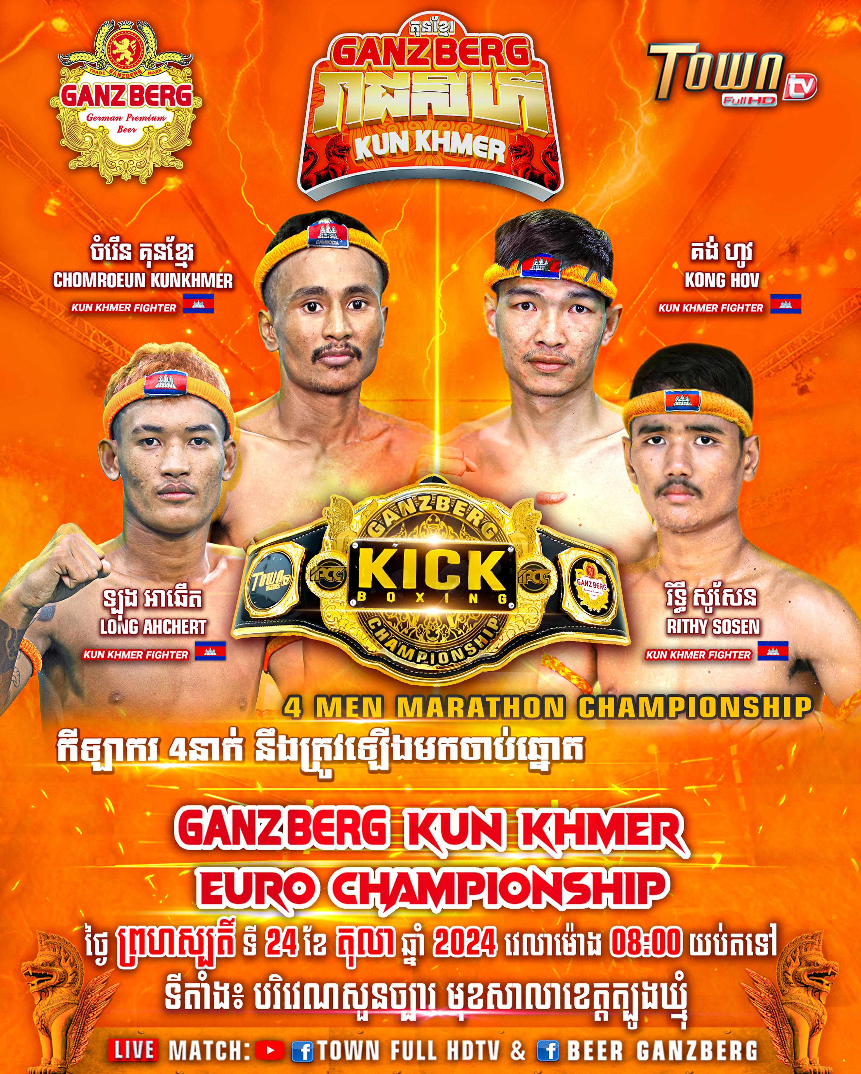 GANZBERG លើកស្ទួយគុនខ្មែរ ឡើងដល់កម្រិតពិភពលោកបាននាំយកបេក្ខភាព បេក្ខភាពម៉ារ៉ាតុនដណ្តើមខ្សែក្រវាត់ 4MAN Kickboxing រាជសីហ៍គុនខ្មែរ ប្រមូលផ្ដុំសុទ្ធតែ ជើងខ្លាំងនៅលើសមរភូមិគុនខ្មែរក្នុងនោះ មានវត្តមាន កីឡាកររន្ទះជើងវ័យក្មេង ឡុង អាឆើត,អ្នកលេងរន្ទះជើងពិឃាត ចំរើន គុនខ្មែរ ប៉ះកំពូលអ្នកលេងជើង ប្រលែងកែង គង់ ហូវ,កំពូលអ្នកលេងកណ្ដាប់ដៃ រិទ្ធី សូសែន។ កីឡាករជើងខ្លាំងទាំងបួននាក់នេះ នឹងត្រូវឡើងមកចាប់ឆ្នោត ដើម្បីស្វែងរកដៃគូប៉ះគ្នាក្នុងជុំ ១ ដើម្បីជម្រុះយកជើងខ្លាំងតែពីររូបគត់ឡើងទៅប្រកួតវគ្គផ្ដាច់ព្រាត់ដណ្ដើមខ្សែក្រវ៉ាត់ដ៏ធំ និងស្រស់ស្អាតមួយនេះ។