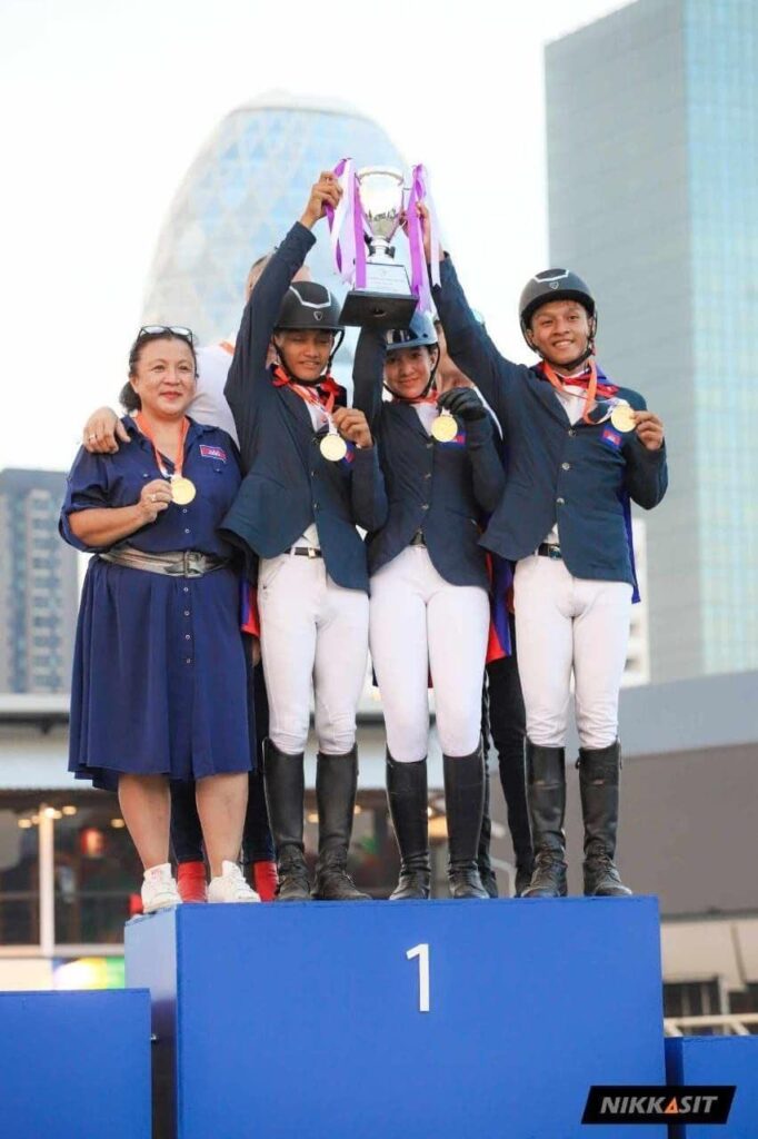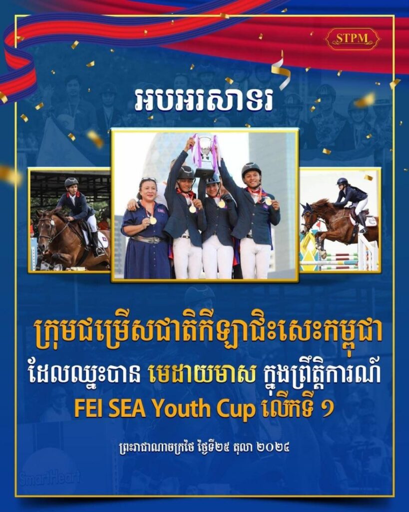 (ភ្នំពេញ)៖ ក្រុមកីឡាជិះសេះជម្រើសជាតិកម្ពុជា បានដណ្ដើមមេដាយមាស ក្នុងព្រឹត្តិការណ៍ FEI SEA Youth Cup លើកទី១ ឆ្នាំ២០២៤ នៅប្រទេសថៃ នាចុងសប្ដាហ៍នេះ ។