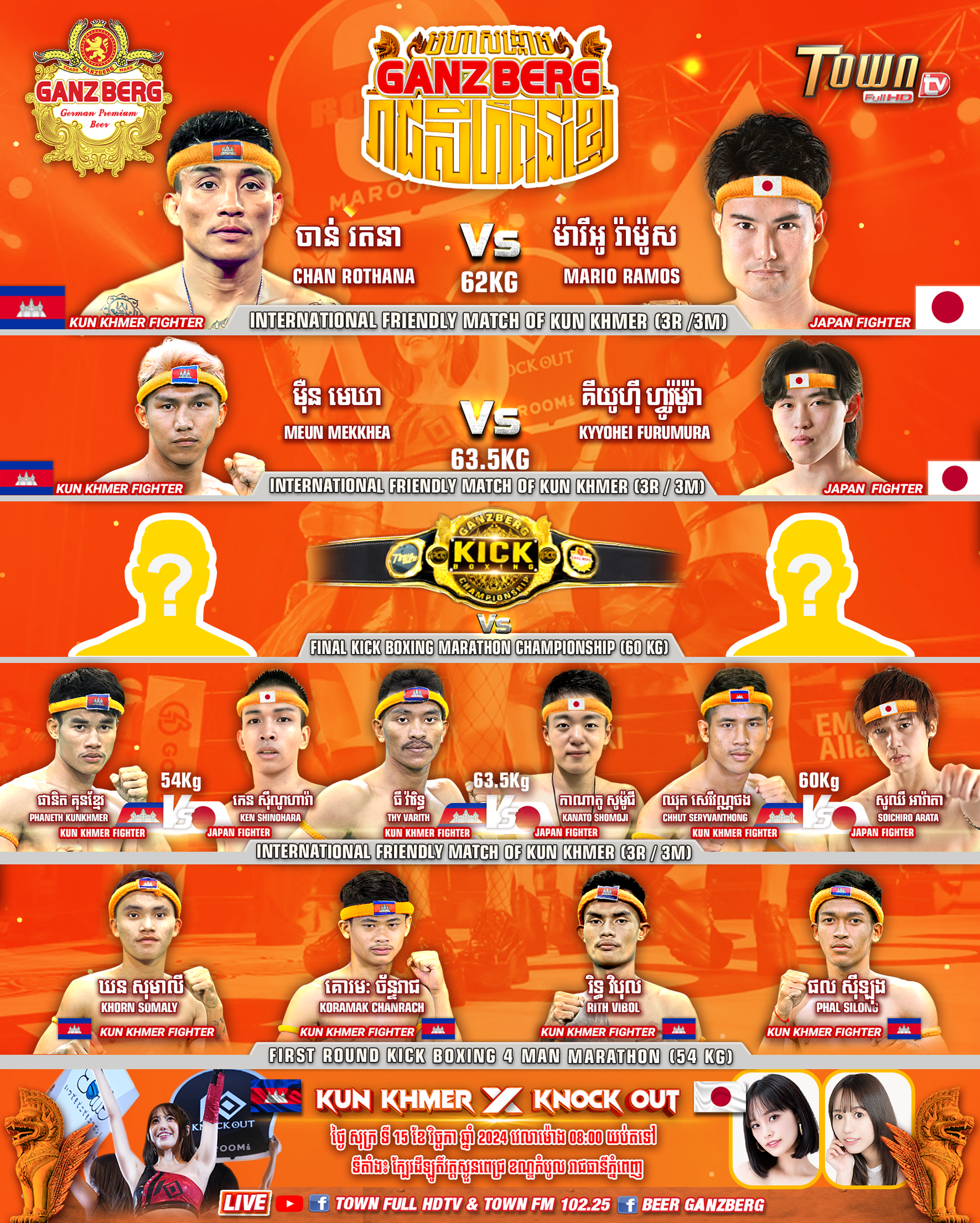 GANZBERG លើកស្ទួយគុនខ្មែរ ឡើងដល់កម្រិតពិភពលោក ដោយត្រៀមរៀបចំការប្រកួតខ្នាតធំ ដាក់សុទ្ធតែកំពូលអ្នកប្រយុទ្ធលើសង្វៀនលំដាប់ជួរមុខទាំងជាតិ និងអន្តរជាតិ។ កីឡាករលំដាប់ប្រទេសជាច្រើនរូប នឹងប្រយុទ្ធក្បាច់គុនខ្មែរត្រៀមឡើងប្រកួតជាមួយកីឡាករជើងខ្លាំងមកពីជប៉ុន ក្នុងកម្មវិធី មហាសង្គ្រាម GANZBERG រាជសីហ៍គុនខ្មែរ KUN KHMER x KNOCK OUT។