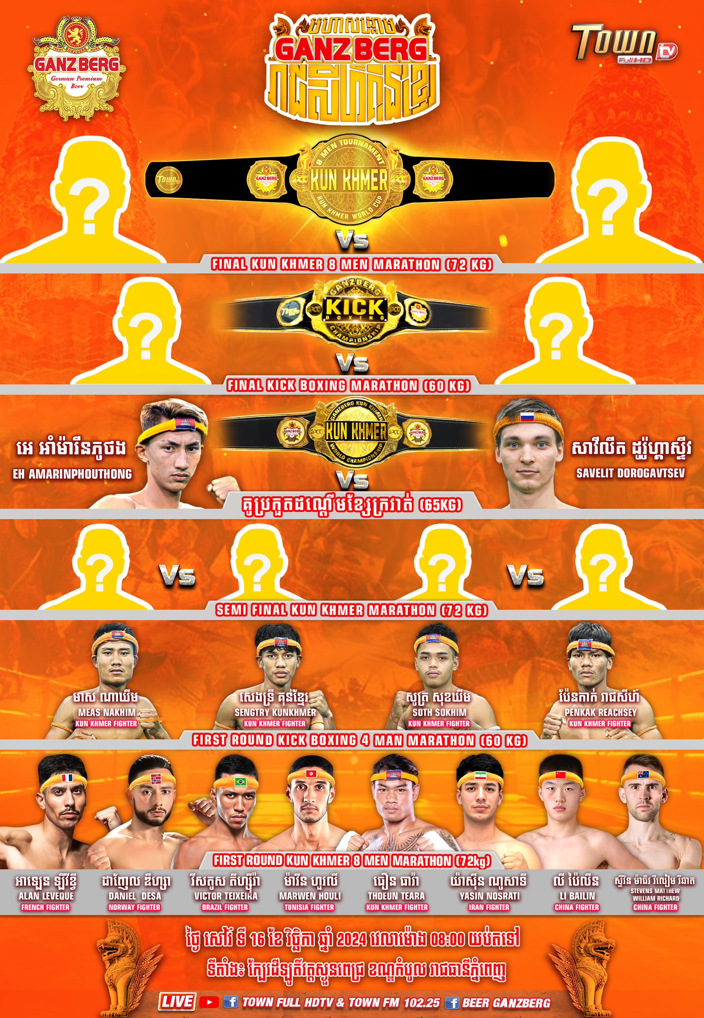 GANZBERG ជួយកីឡាករគុនខ្មែរ កុំភ្លេចចូលរួមទស្សនាឲ្យបានច្រើនកុះករ នាថ្ងៃទី 15 – 16 ខែវិច្ឆិកា ឆ្នាំ២០២៤ខាងមុខនេះ កម្មវិធីចាប់ផ្តើមពីម៉ោង ៨យប់តទៅ ទីតាំងនៅក្បែរដីឡូតិ៍វត្តស្ងួនពេជ្រ ខណ្ឌកំបូល រាជធានីភ្នំពេញ ។ ជាមួយគ្នានោះ ក៏មានផ្សាយផ្ទាល់នៅលើកញ្ចក់ទូរទស្សន៍ TOWN FULL HDTV និងនៅលើហ្វេសប៊ុកផេក TOWN FULL HDTV, TOWN FM 102.25 និង BEER GANZBERG ផងដែរ ។