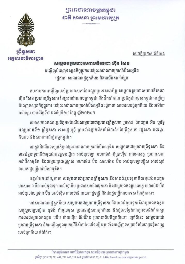 (ភ្នំពេញ)៖ នៅព្រឹកថ្ងៃទី៨ ខែធ្នូ ឆ្នាំ២០២៤នេះ សម្តេចអគ្គមហាសេនាបតីតេជោ ហ៊ុន សែន ប្រធានព្រឹទ្ធសភានៃព្រះរាជាណាចក្រកម្ពុជា ដឹកនាំគណៈប្រតិភូជាន់ខ្ពស់កម្ពុជា អញ្ជើញបំពេញទស្សនកិច្ចផ្លូវការ នៅព្រះរាជាណាចក្រអារ៉ាប៊ីសាអូឌីត រដ្ឋកាតា សាធារណរដ្ឋតួកគីយេ និងអេមីរ៉ាតអារ៉ាប់រួម សរុបរយៈពេល១សប្តាហ៍ ចាប់ពីថ្ងៃទី៨ ដល់ថ្ងៃទី១៤ ខែធ្នូ ឆ្នាំ២០២៤។