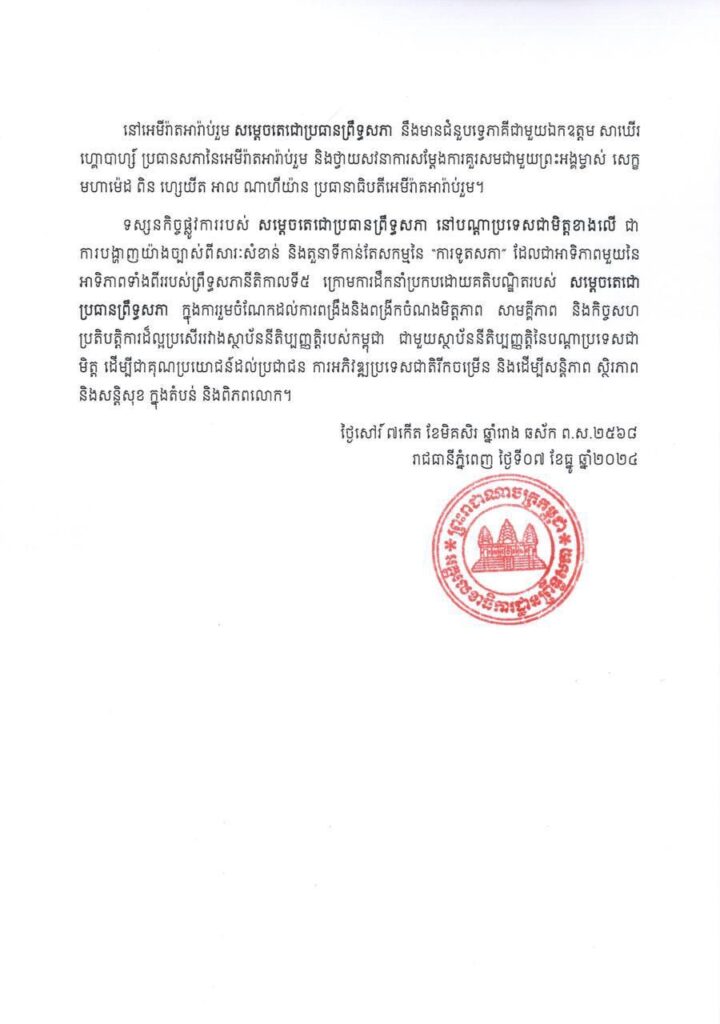 នៅអេមីរ៉ាតអារ៉ាប់រួម សម្តេចតេជោប្រធានព្រឹទ្ធសភា នឹងមានជំនួបទ្វេភាគីជាមួយលោក សាឃើរ ហ្គោបាហ្ស ប្រធានសភានៃអេមីរ៉ាតអារ៉ាប់រួម និងថ្វាយសវនាការសម្តែងការគួរសមជាមួយព្រះអង្គម្ចាស់ សេក្ខ មហាម៉េដ ពិន ហ្សេយឺត អាល ណាហ៊ីយ៉ាន ប្រធានាធិបតីអេមីរ៉ាតអារ៉ាប់រួម។