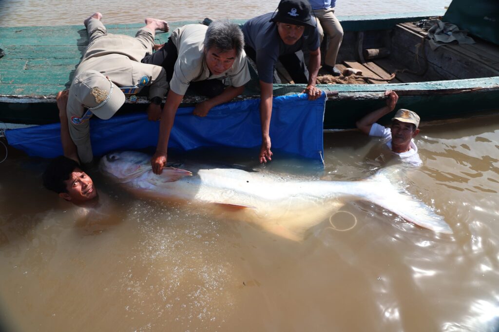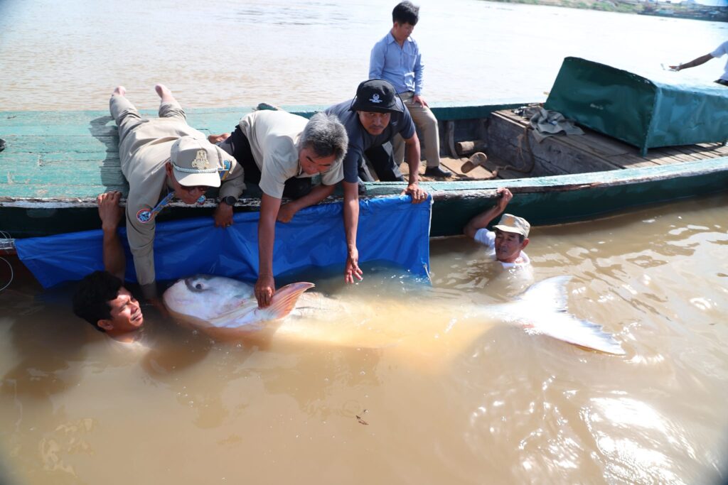 ត្រីរាជមួយក្បាល ទម្ងន់១៣២គីឡូក្រាម ដែលចាប់បានដោយអ្នកនេសាទ ទទួលបានការជួយសង្គ្រោះ និងលែងចូលបឹងធម្មជាតិវិញ