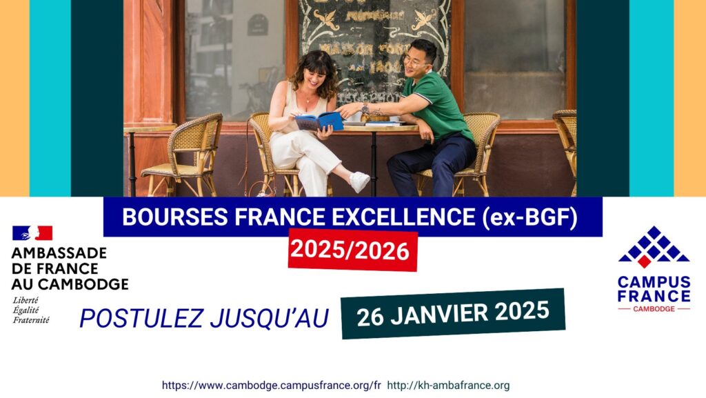 (ភ្នំពេញ)៖ ស្ថានទូតបារាំងប្រចាំកម្ពុជាមានសេចក្តីរីករាយប្រកាសបើកទទួលពាក្យសុំអាហារូបករណ៍ «France Excellence» សម្រាប់ឆ្នាំសិក្សា ២០២៥-២០២៦។ កាលពីមុនមានឈ្មោះថាអាហារូបករណ៍រដ្ឋាភិបាលបារាំង(BGF) កម្មវិធី អាហារូបករណ៍ ដ៏ឧត្តុង្គឧត្តមនេះបើកទូលាយសម្រាប់និស្សិត និងអ្នកស្រាវជ្រាវវ័យក្មេងកម្ពុជាទាំងអស់ ដែលមានបំណងទៅបន្តការសិក្សានៅប្រទេសបារំាង ថ្នាក់បរិញ្ញាបត្រជាន់ខ្ពស់ ឬថ្នាក់បណ្ឌិត ដោយសិក្សាជាភាសាបារាំងក៏បាន ឬភាសាអង់គ្លេសក៏បាន។