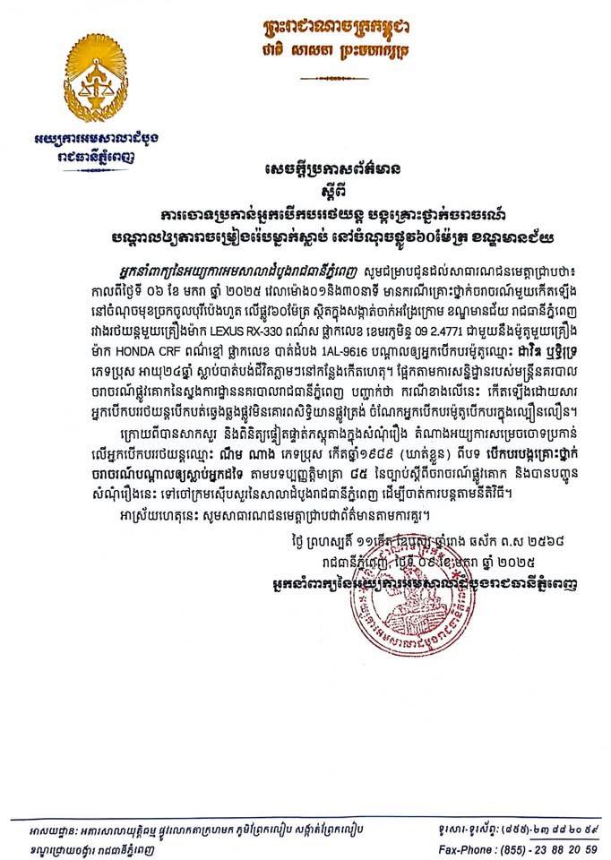 នៅសេចក្ដីប្រកាសព័ត៌មាន អ្នកនាំពាក្យនៃអយ្យការអមសាលាដំបូងរាជធានីភ្នំពេញ គូសបញ្ជាក់ថា កាលពីថ្ងៃទី ០៦ ខែ មករា ឆ្នាំ ២០២៥ វេលាម៉ោង ០១និង៣០នាទី មានករណីគ្រោះថ្នាក់ចរាចរណ៍មួយកើតឡើង នៅចំណុចមុខច្រកចូលបុរីប៉េងហួត លើផ្លូវ៦០ម៉ែត្រ ស្ថិតក្នុងសង្កាត់ចាក់អង្រែក្រោម ខណ្ឌមានជ័យ រាជធានីភ្នំពេញ រវាងរថយន្តមួយគ្រឿងម៉ាក LEXUS RX-330 ពណ៌ស ផ្លាកលេខ ខេមរភូមិន្ទ 09 2.4771 ជាមួយនឹងម៉ូតូមួយគ្រឿង ម៉ាក HONDA CRF ពណ៌ខ្មៅ ផ្លាកលេខ បាត់ដំបង 1AL-9616 បណ្តាលឲ្យអ្នកបើកបរម៉ូតូឈ្មោះ ដាវិឌ ឬទ្ធិរុទ្រ ភេទប្រុស អាយុ២៤ឆ្នាំ ស្លាប់បាត់បង់ជីវិតភ្លាមៗនៅកន្លែងកើតហេតុ។ ផ្អែកតាមការសន្និដ្ឋានរបស់មន្ត្រីនគរបាល ចរាចរណ៍ផ្លូវគោកនៃស្នងការដ្ឋាននគរបាលរាជធានីភ្នំពេញ បញ្ជាក់ថា ករណីខាងលើនេះ កើតឡើងដោយសារ អ្នកបើកបររថយន្តបើកបត់ឆ្វេងឆ្លងផ្លូវមិនគោរពសិទ្ធិយានផ្លូវត្រង់ ចំណែកអ្នកបើកបរម៉ូតូបើកបរក្នុងល្បឿនលឿន។