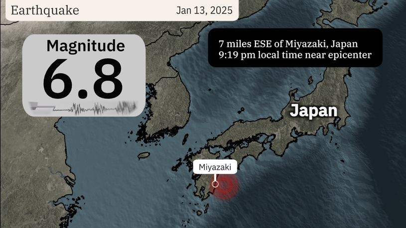 (តូក្យូ)៖ គ្រោះរញ្ជួយដីកម្រិត ៦.៩ រ៉ិចទ័រ បានវាយប្រហារកោះ Kyushu ភាគខាងត្បូងប្រទេសជប៉ុន នៅថ្ងៃចន្ទនេះ ដោយបានបង្កឱ្យមានការប្រកាសអាសន្នរលកយក្សស៊ូណាមិ សម្រាប់ខេត្ត Miyazaki និង Kochi នេះបើយោងតាមទីភ្នាក់ងារឧតុនិយមជប៉ុន (JMA)។